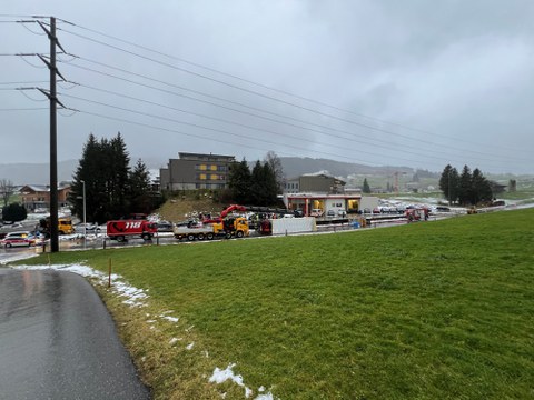 Dreifacher Brandschutz. Verkehrsumleitung. Auslaufende Kraftstoffe abstreuen und aufnehmen. Ladung auf Gefahrenstoffe prüfen. Lastwagen und Ladung sichern und ausladen. Aufräumarbeiten.