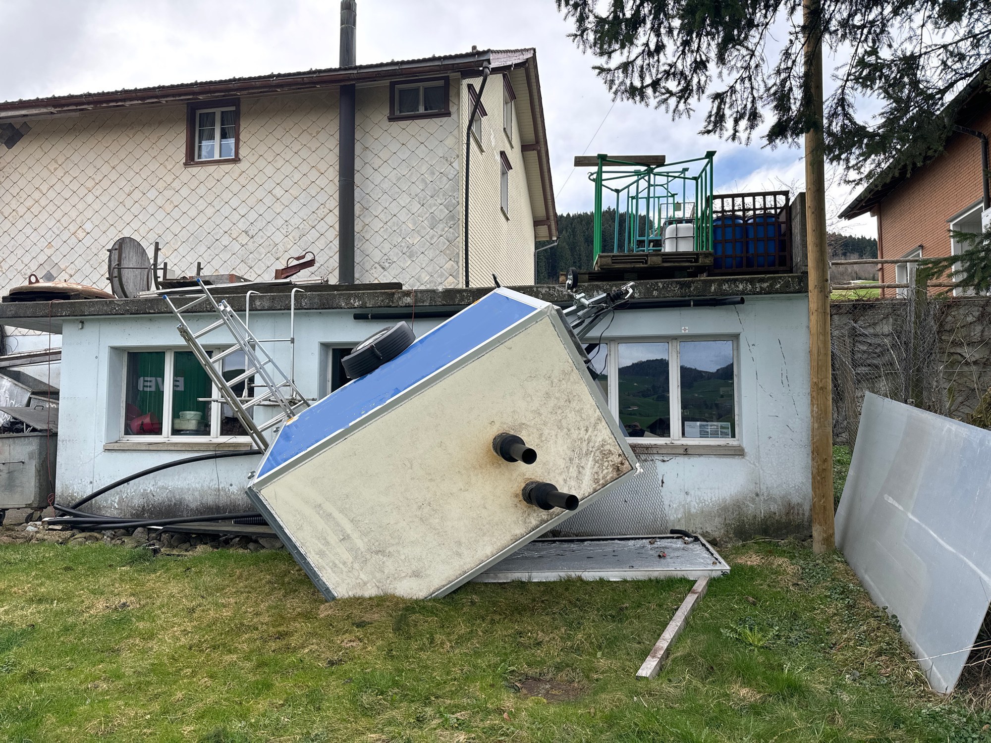 Umgestürzter Anhänger aufstellen. Bachsperren einsetzen und Einstreustellen einrichten. Ausgelaufenes Öl binden und auffangen.