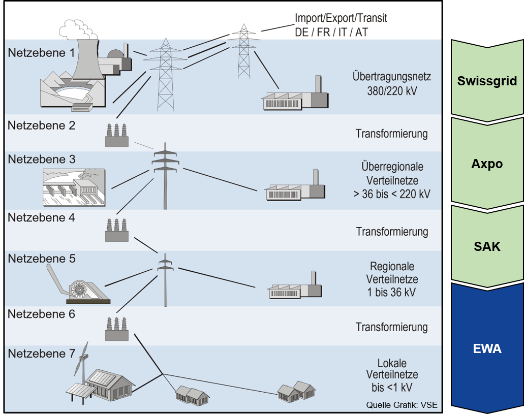 Vom Kraftwerk bis zum Hausanschluss legt der Strom einen weiten Weg zurück. Das Schweizerische Übertragungs- und Verteilnetz wird in sieben sogenannte Netzebenen aufgeteilt. Jeder Netzbetreiber ist auf eine oder mehrere Netzebenen spezialisiert und betreibt die dazugehörigen Netzanlagen. Diese Aufteilung ist sinnvoll, damit der Strom mit Hilfe von höheren Spannungen möglichst verlustarm über weite Strecken transportiert werden kann. In Unterwerken und Transformatorenstationen werden die verschiedenen Spannungsebenen mit Hilfe von Transformatoren miteinander verbunden. Detaillierte Informationen finden Sie in den Erläuterungen des Verbands Schweizerischer Elektrizitätsunternehmen.