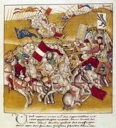 Der Konflikt eskalierte, als sich der eidgenössische Stand Schwyz auf Seiten der Aufständischen engagierte. Den Schwyzern, die danach trachteten, ihre Macht in der Ostschweiz zu erweitern, kamen die aufmüpfigen Appenzeller gerade recht. Abt Kuno hingegen verfügte seit 1392 über ein Schutzbündnis mit den österreichisch-habsburgischen Herzögen. Nachdem die Innerrhoder 1402 die Burg Clanx zerstört hatten, kam es 1403 in der Schlacht auf der Vögelinsegg in der Nähe von Speicher (AR) zur bewaffneten Entscheidung, in der die Appenzeller die Oberhand behielten. Nach einer weiteren Niederlage des äbtischen Lagers in der Schlacht am Stoss (1405) bei Gais (AR) gab es für die Appenzeller und St.Galler kein Halten mehr. Als 'Bund ob dem See' unternahmen sie Eroberungs- und Plünderungszüge, die sie bis weit ins Thurgau und sogar bis über den Arlberg hinausführten. Unter dem weltlichen Adel und der kirchlichen Obrigkeit verbreiteten sie Angst und Schrecken, unter den Bauern, die nichts zu verlieren hatten, ernteten sie jedoch auch Bewunderung für ihren Freiheitswillen. Viele Landschaften und Orte in der Ostschweiz, im Vorarlberg und sogar im Tirol schlossen sich dem Bund ob dem See aus freien Stücken an.