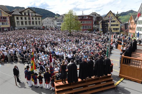 Die Landsgemeinde findet einmal im Jahr, jeweils am letzten Sonntag im April, statt. Dabei versammeln sich alle stimmberechtigten Bürgerinnen und Bürger von Appenzell I.Rh. auf dem Landsgemeindeplatz in Appenzell zur Bestellung der obersten Behörden und zur Beschlussfassung über wichtige Landesangelegenheiten.