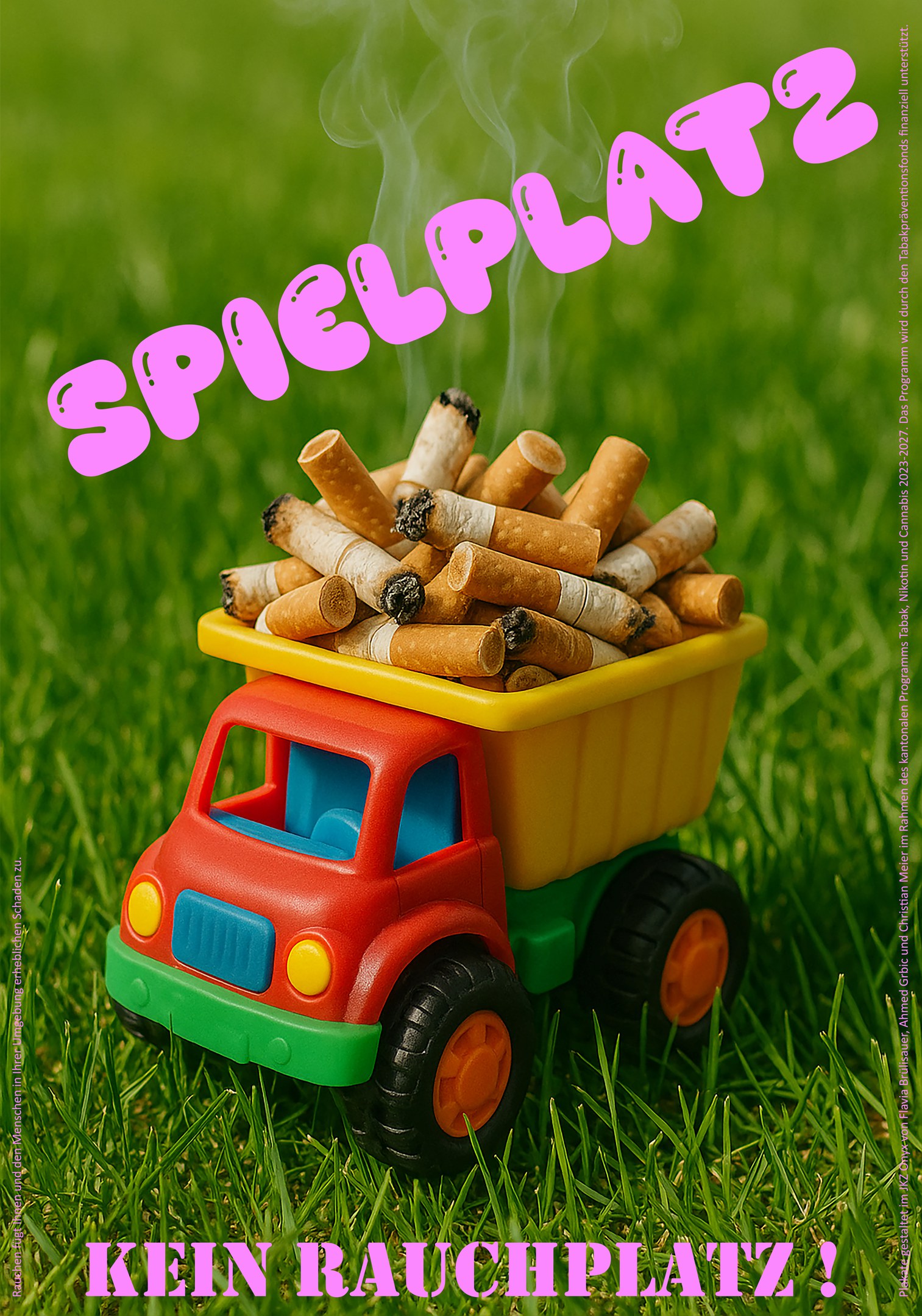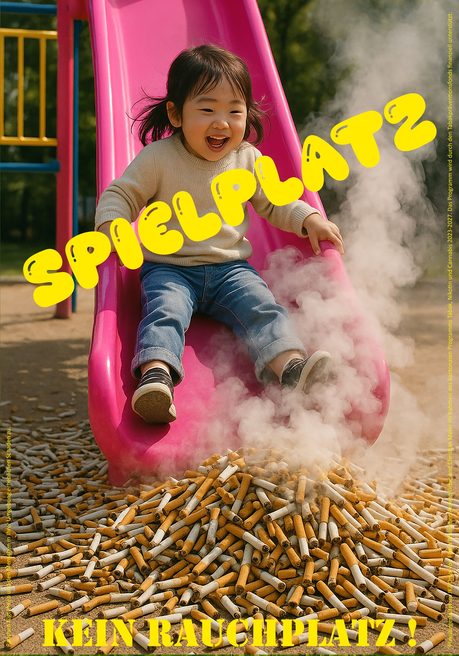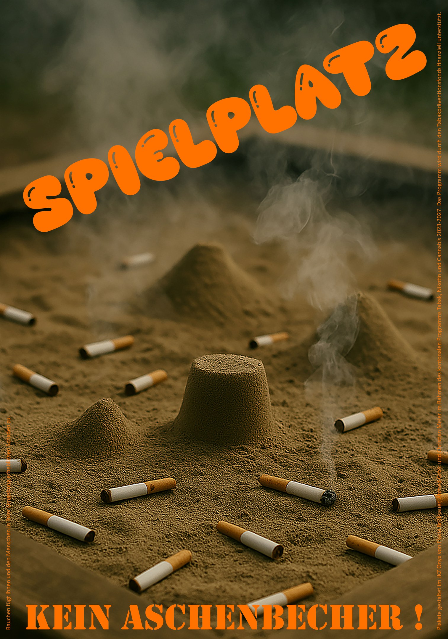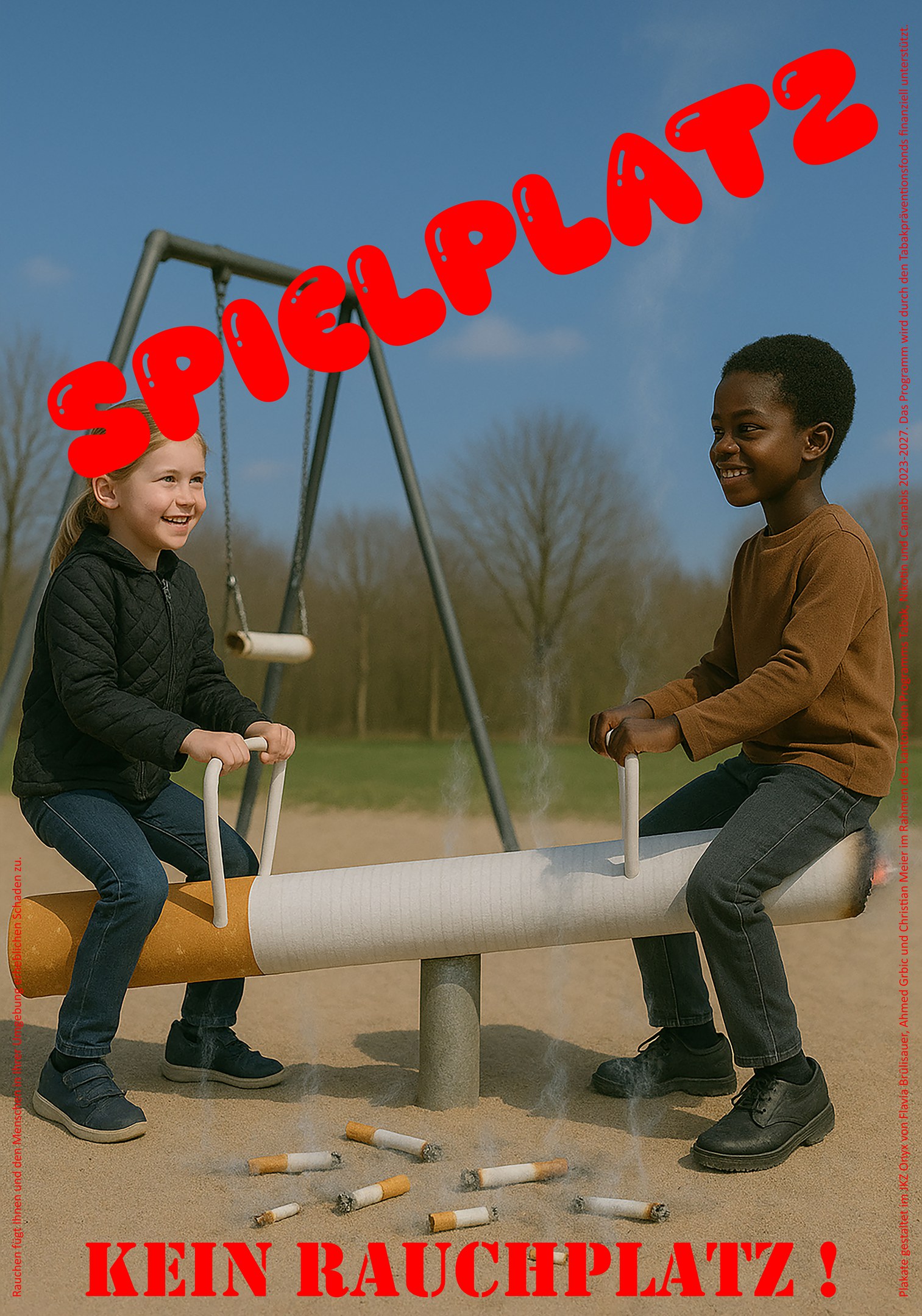 Zwei Jugendliche gestalteten gemeinsam mit dem Künstler Christian Meier eindrückliche Plakate, die zum Rauchverzicht auf Spielplätzen aufrufen. Das Projekt wurde im Jugendkulturzentrum Appenzell umgesetzt. Die Plakate waren von Juli bis Oktober 2025 auf den grossen Spielplätzen im Kanton zu sehen.