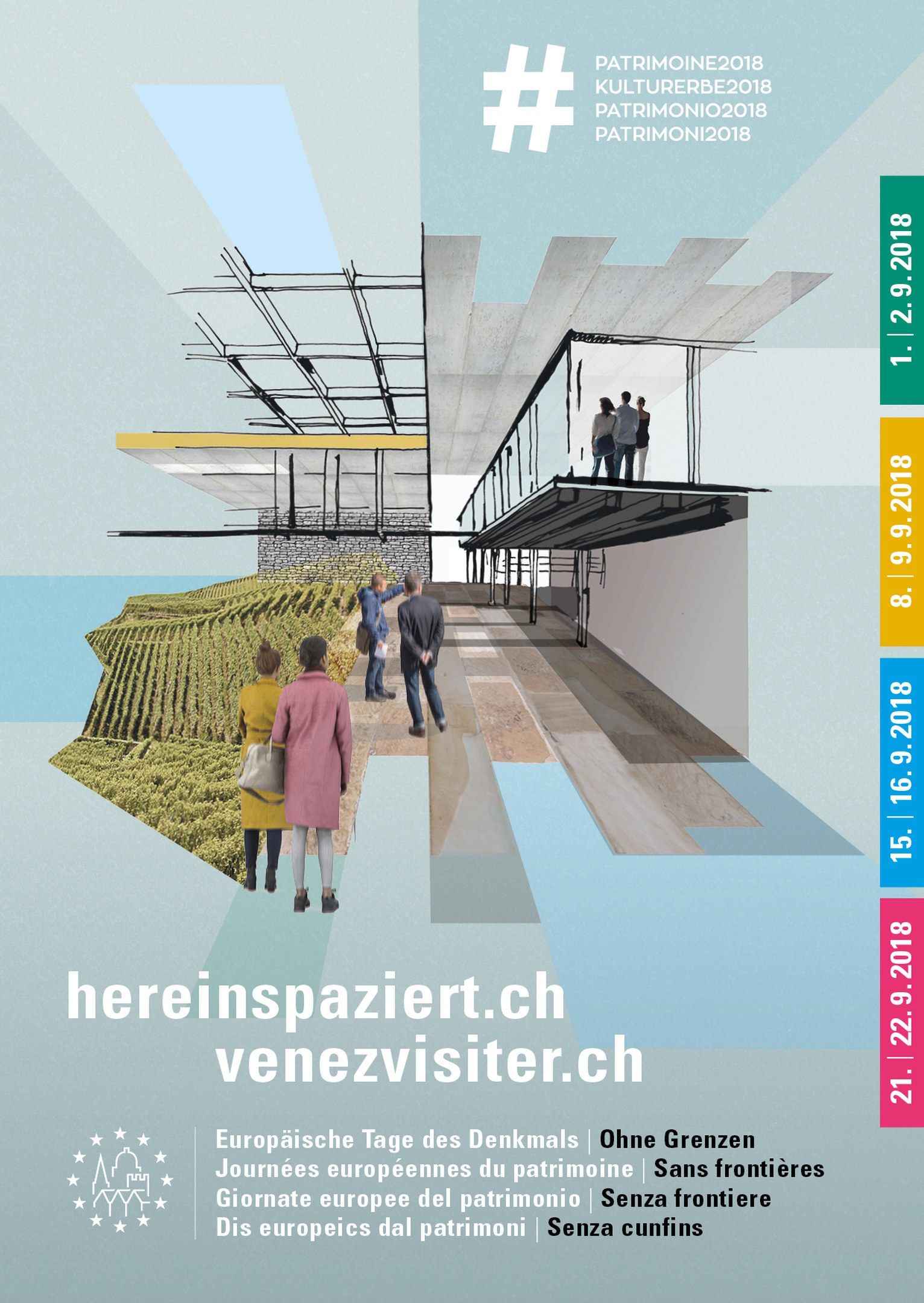 Die Europäischen Tage des Denkmals weisen zu ihrem Jubiläum im Europäischen Kulturerbejahr 2018 ein spezielles Format auf. Sie finden nicht wie gewohnt an einem, sondern gleich an vier Wochenenden vom 1. bis 23. September 2018 statt. Das Thema «Ohne Grenzen» ist Programm: Jeweils eine Region präsentiert ihr kulturelles Erbe und lädt Nachbarn aus dem In- und Ausland zu einem Besuch ein. Dabei sollen Grenzen nicht nur geographisch, sondern auch sprachlich, chronologisch, materiell und sozial überschritten werden. Informationen über das gesamtschweizerische Programm der Denkmaltage sind unter www.hereinspaziert.ch abrufbar.