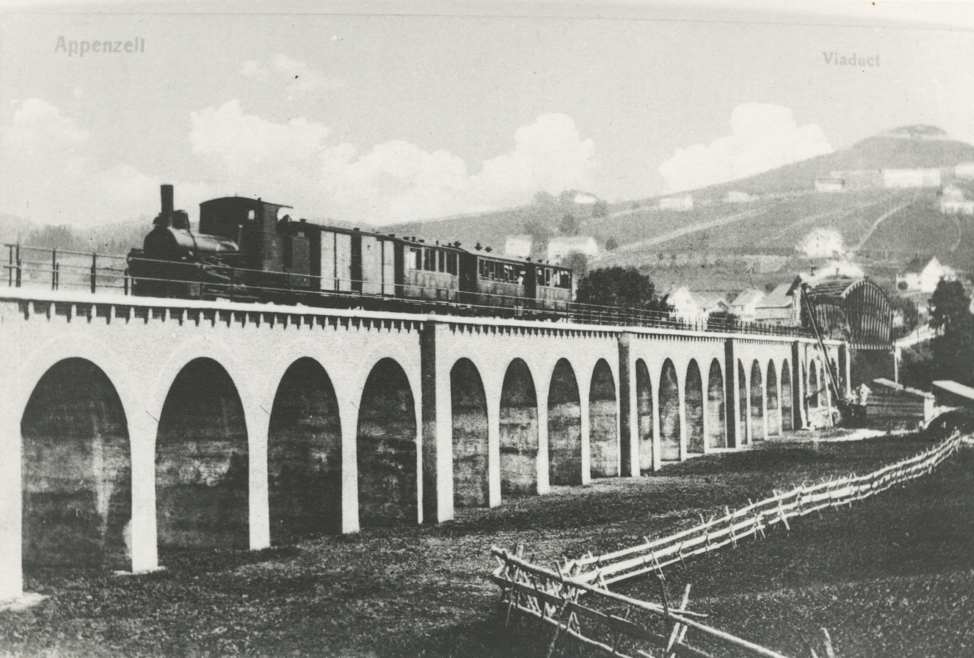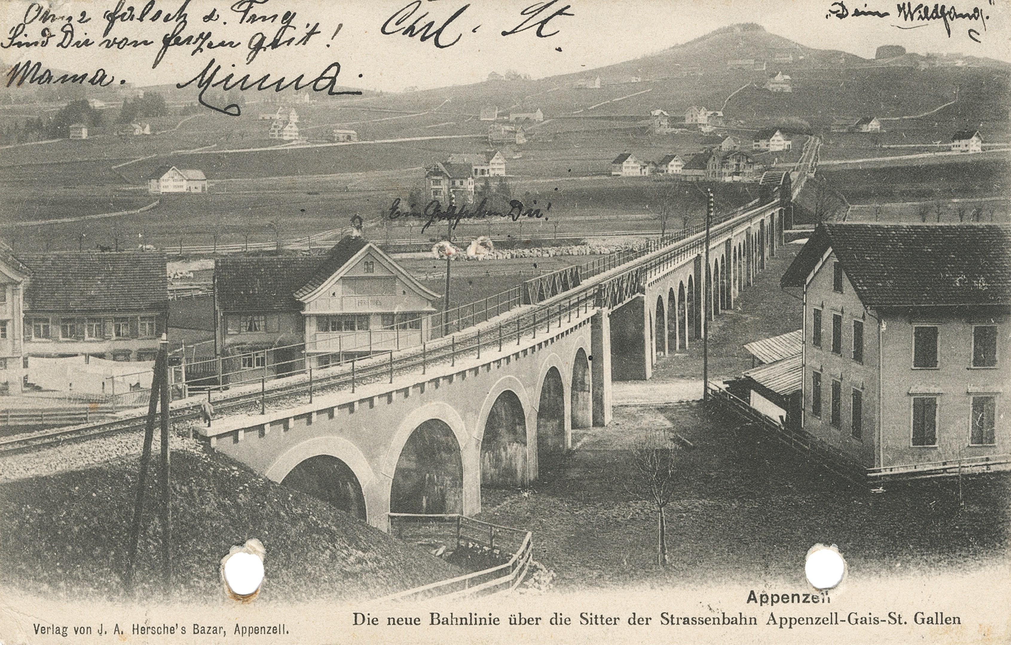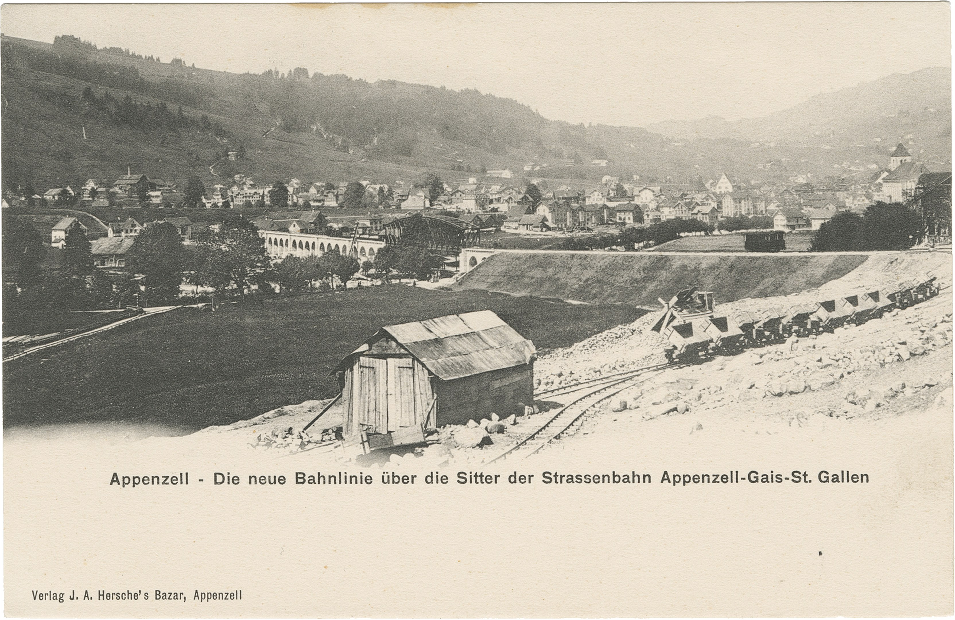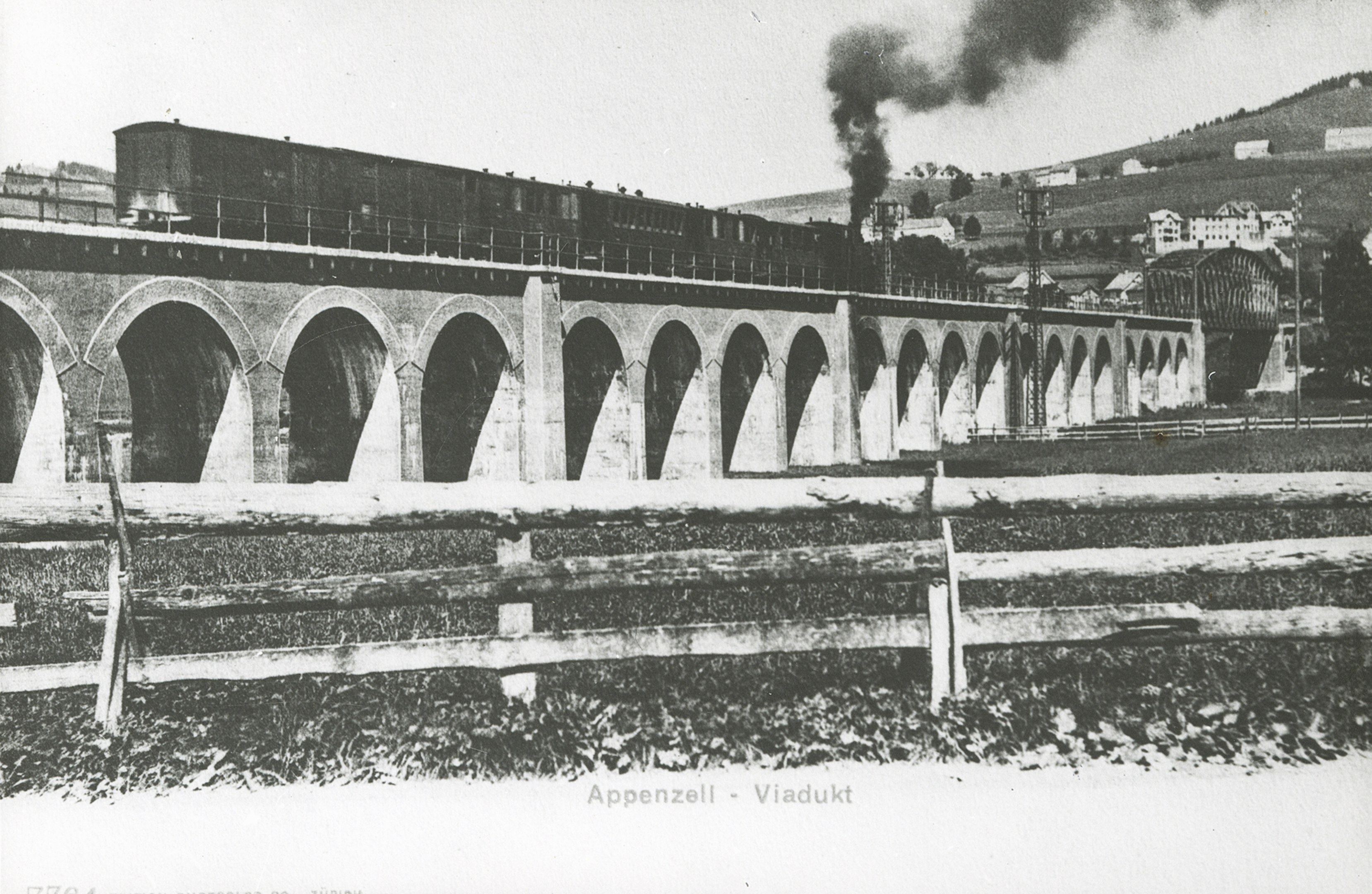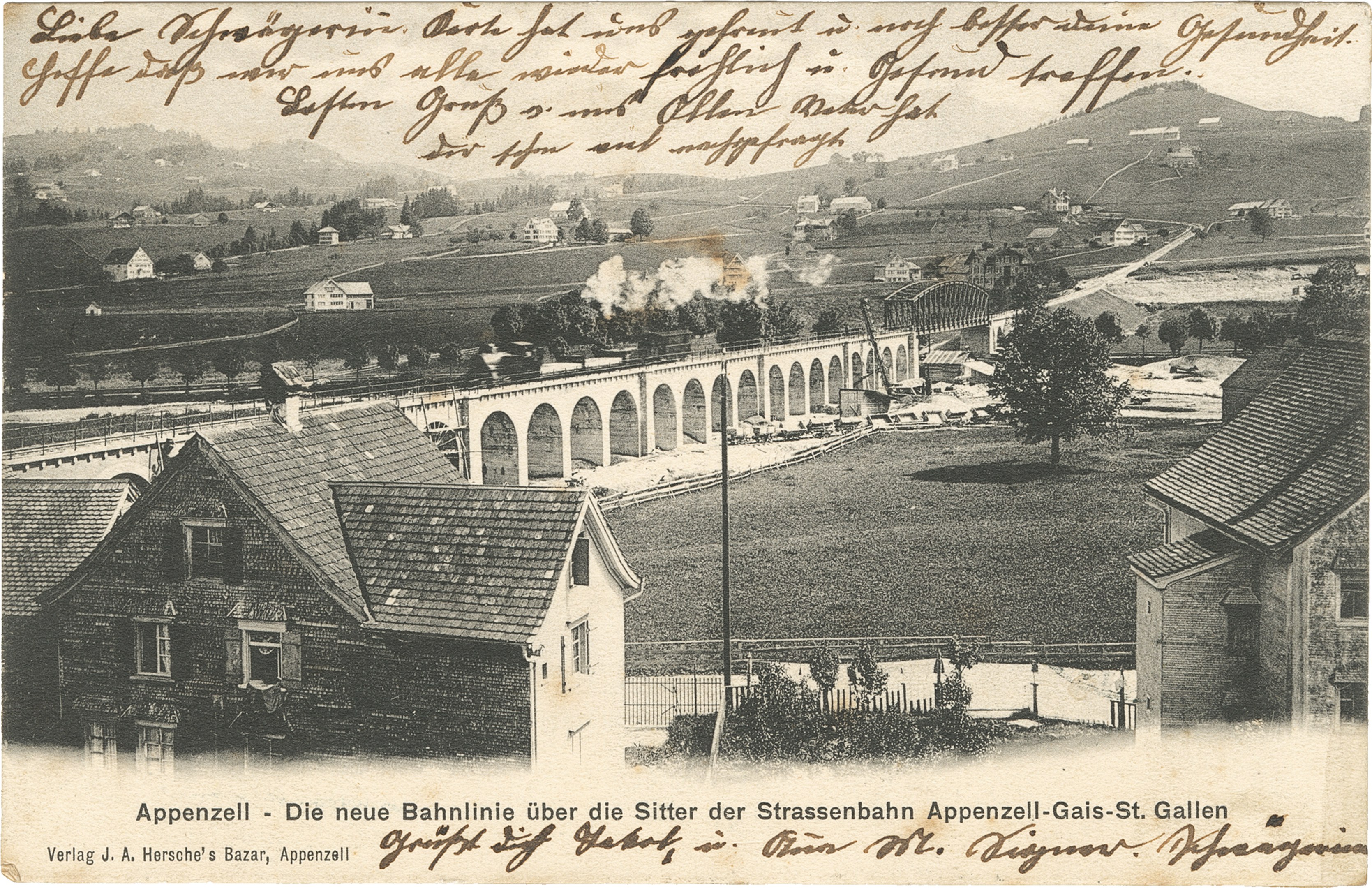 1904 wurde die Strassenbahn von St. Gallen nach Gais bis Appenzell verlängert. Seither bildet das imposante Eisenbahnviadukt des "Gaiserbähnlis" über die Sitter und die Talsenke eine architektonische Landmarke. 2024 wird das Viadukt von den "Appenzeller Bahnen" aufwändig saniert. Die Bildergalerie zeigt einige Postkarten und Fotos aus der Bildersammlung des Landesarchivs. Besonders auf älteren Ansichten steht das neue Viadukt im Mittelpunkt. Zusammen mit den dampfenden Loks und den Hochkaminen der Emil Ebneter AG und der Brauerei Locher will es den Einzug der Moderne in Appenzell symbolisieren.
