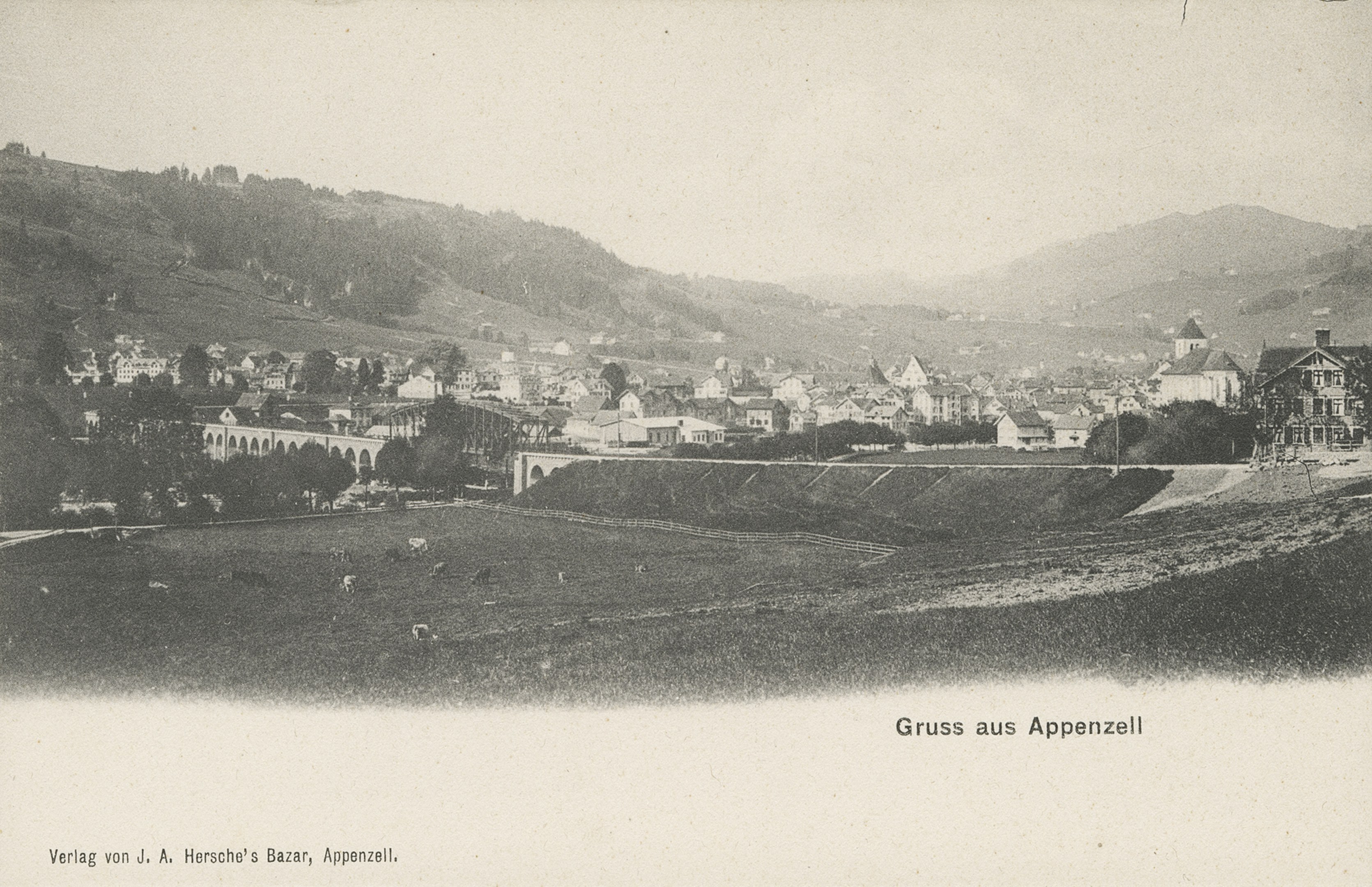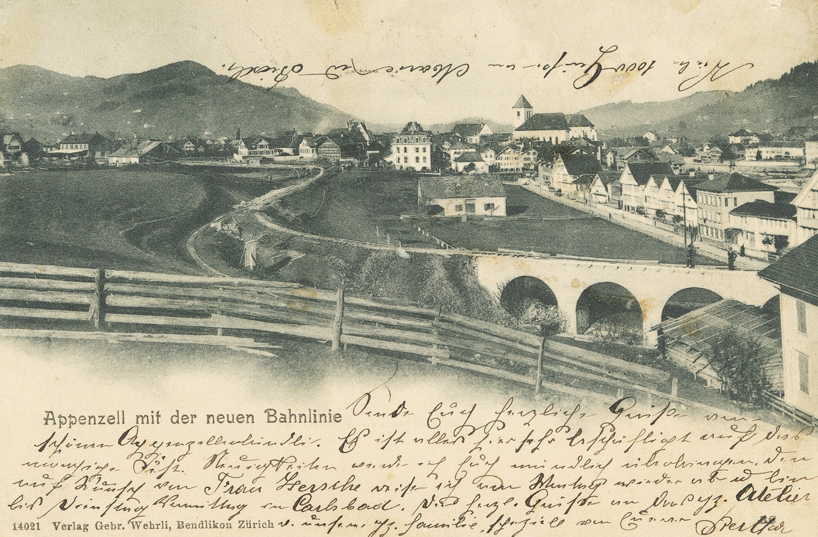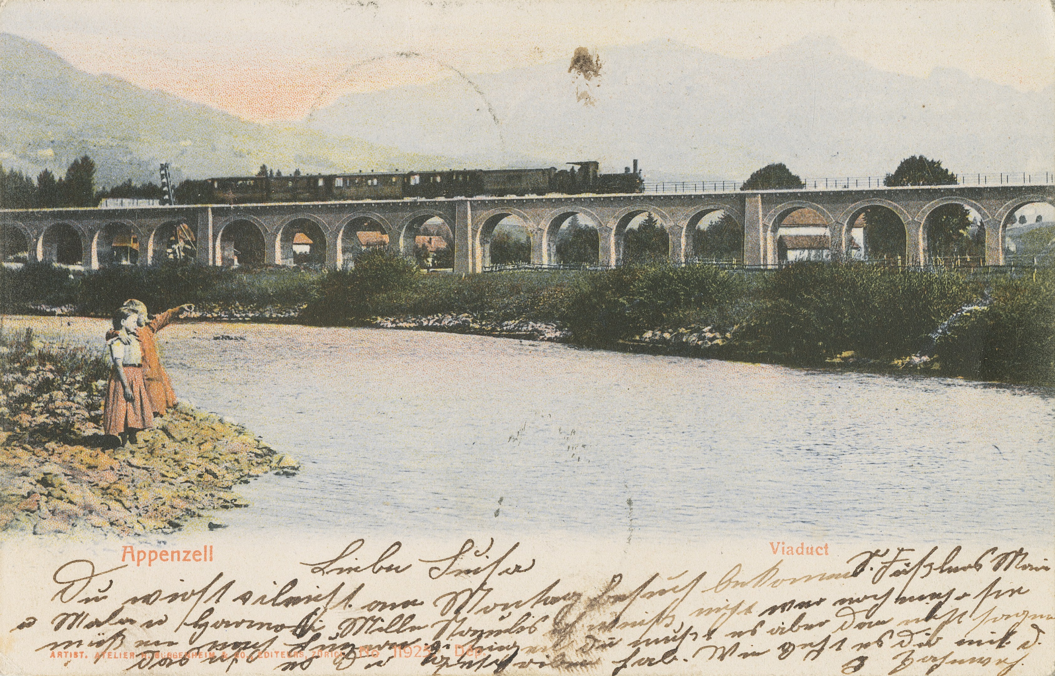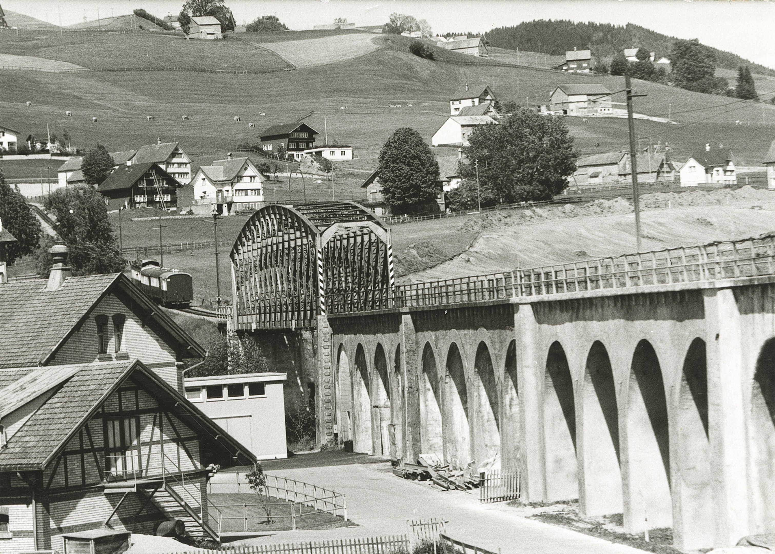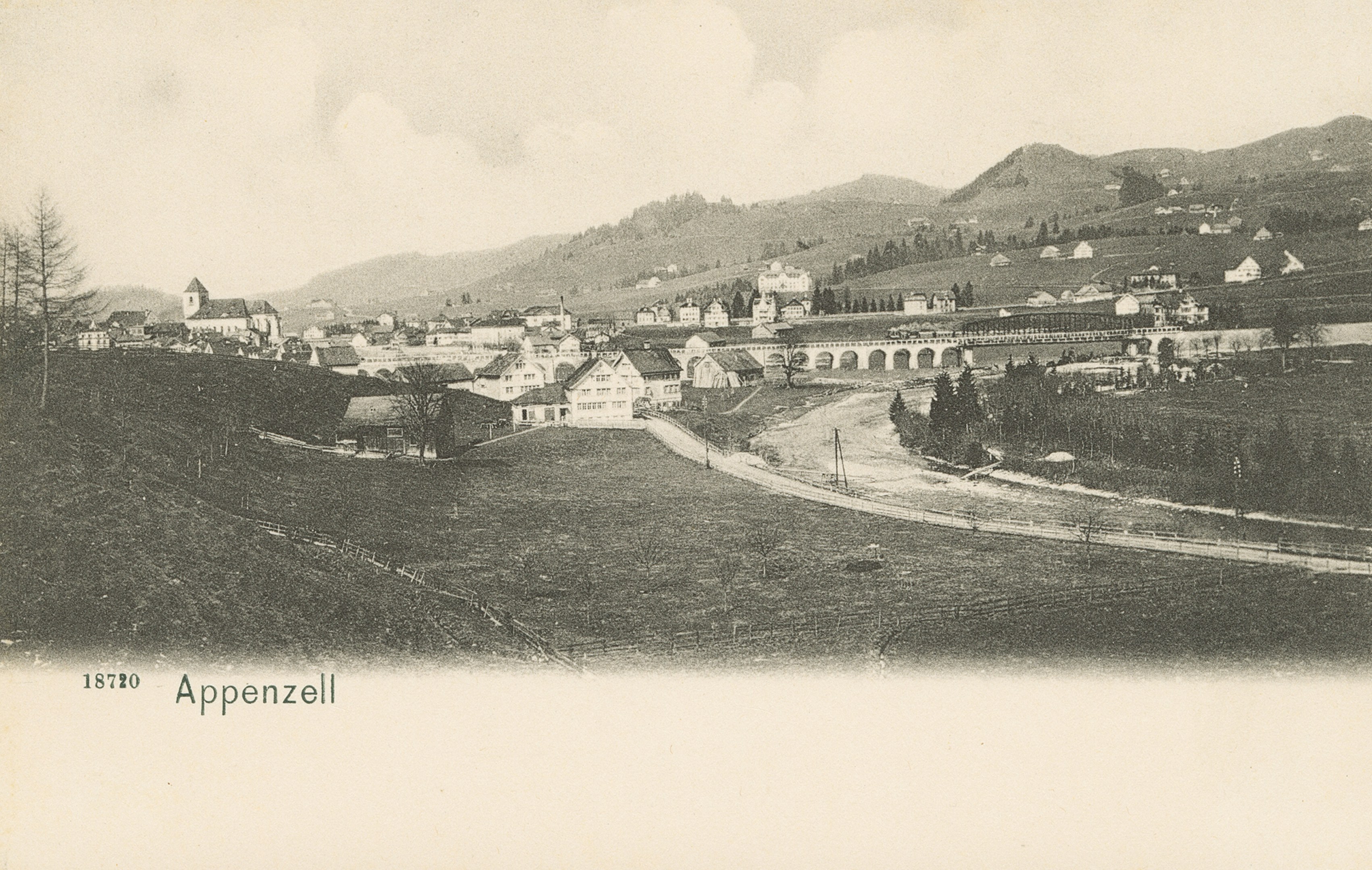 1904 wurde die Strassenbahn von St. Gallen nach Gais bis Appenzell verlängert. Seither bildet das imposante Eisenbahnviadukt des "Gaiserbähnlis" über die Sitter und die Talsenke eine architektonische Landmarke. 2024 wird das Viadukt von den "Appenzeller Bahnen" aufwändig saniert. Die Bildergalerie zeigt einige Postkarten und Fotos aus der Bildersammlung des Landesarchivs. Besonders auf älteren Ansichten steht das neue Viadukt im Mittelpunkt. Zusammen mit den dampfenden Loks und den Hochkaminen der Emil Ebneter AG und der Brauerei Locher will es den Einzug der Moderne in Appenzell symbolisieren.