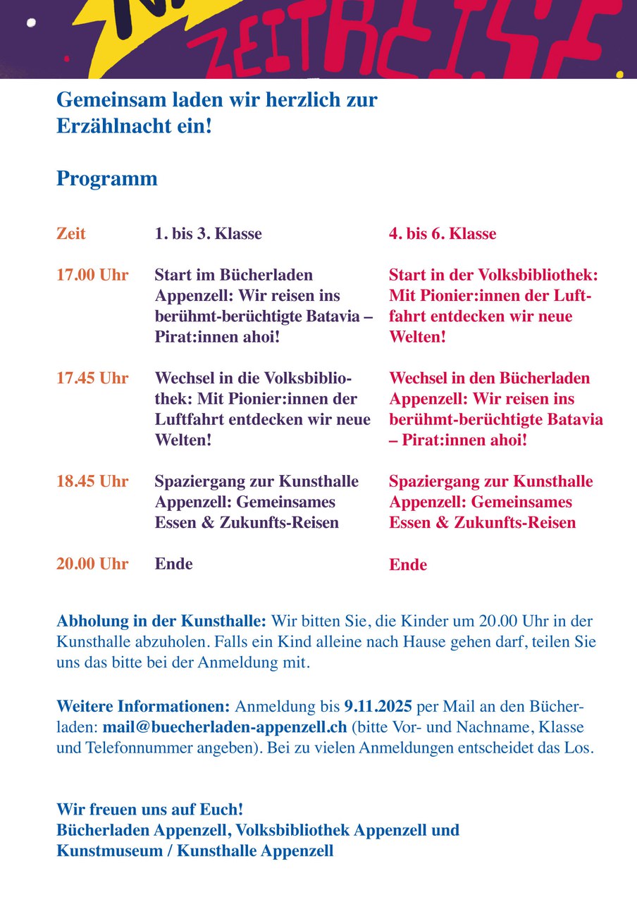 Volksbibliothek Appenzell, Bücherladen Appenzell und Kunstmuseum / Kunsthalle Appenzell laden herzlich ein zur Erzählnacht 2025!