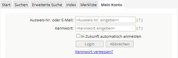 Die Medien können vor Ablauf der Rückgabefrist 2x kostenlos verlängert werden. Bitte loggen Sie sich dazu im online Katalog unter Mein Konto mit Ausweis Nr. und Kennwort ein.