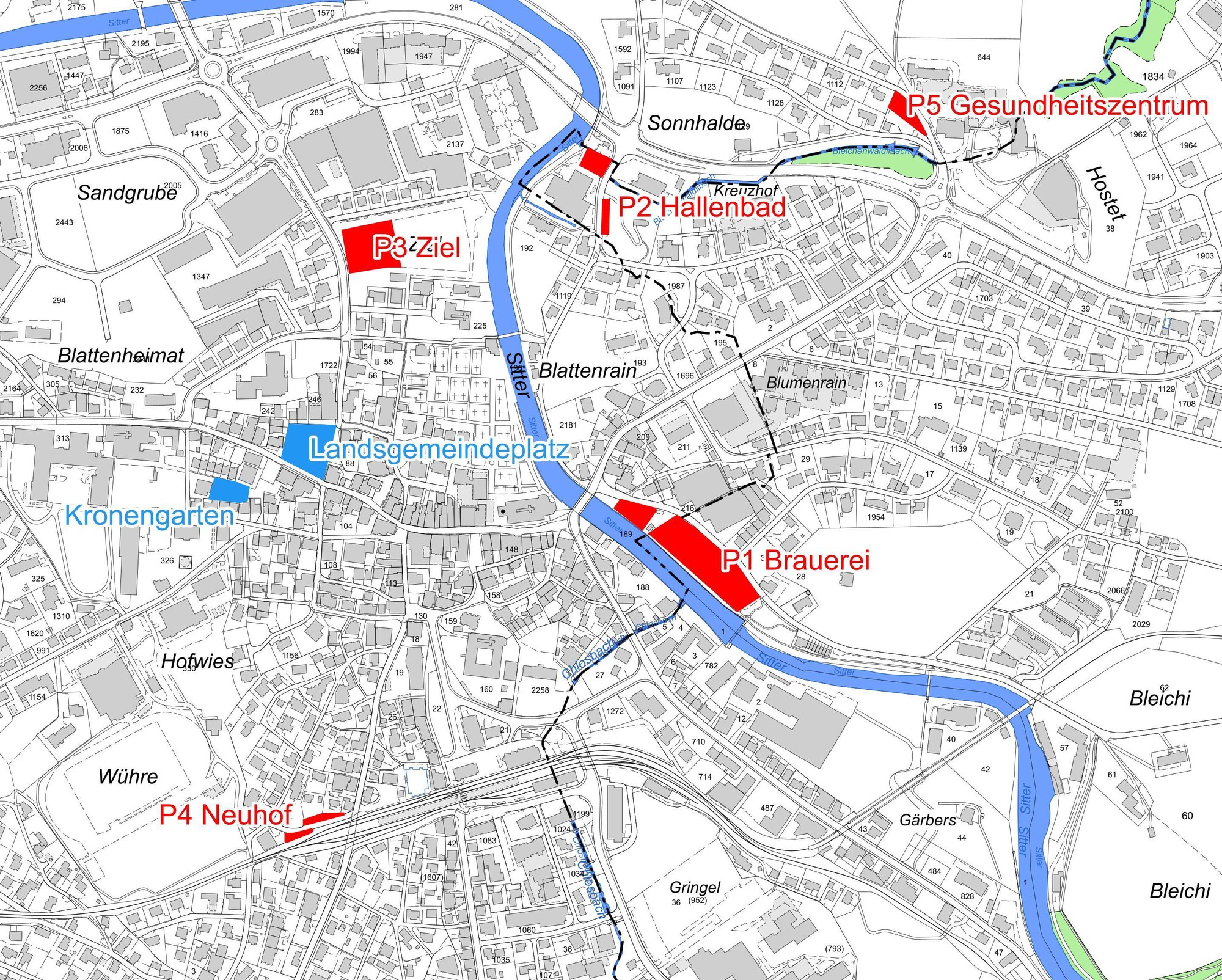 Die rot eingezeichneten Parkplätze Brauerei (P1), Hallenbad (P2), Ziel (P3), Neuhof (P4) und Gesundheitszentrum (P5) sind gebührenpflichtig. Die Bezahlung der Gebühren erfolgt vor Ort am Ticketautomaten (Bargeld nur CHF) oder bargeldlos über mobile Apps wie Twint, Parkingpay und EasyPark (auch für Kreditkarten). Monats- oder Jahresbewilligungen können bei der Bezirksverwaltung Appenzell, im Internet auf www.parkingpay.ch oder über die Parkingpay App gekauft werden. Die Parkdauer ist unbeschränkt. Bei angekündigten Anlässen, für welche ein Parkplatz anderweitig genutzt wird, müssen die Fahrzeuge weggestellt werden.