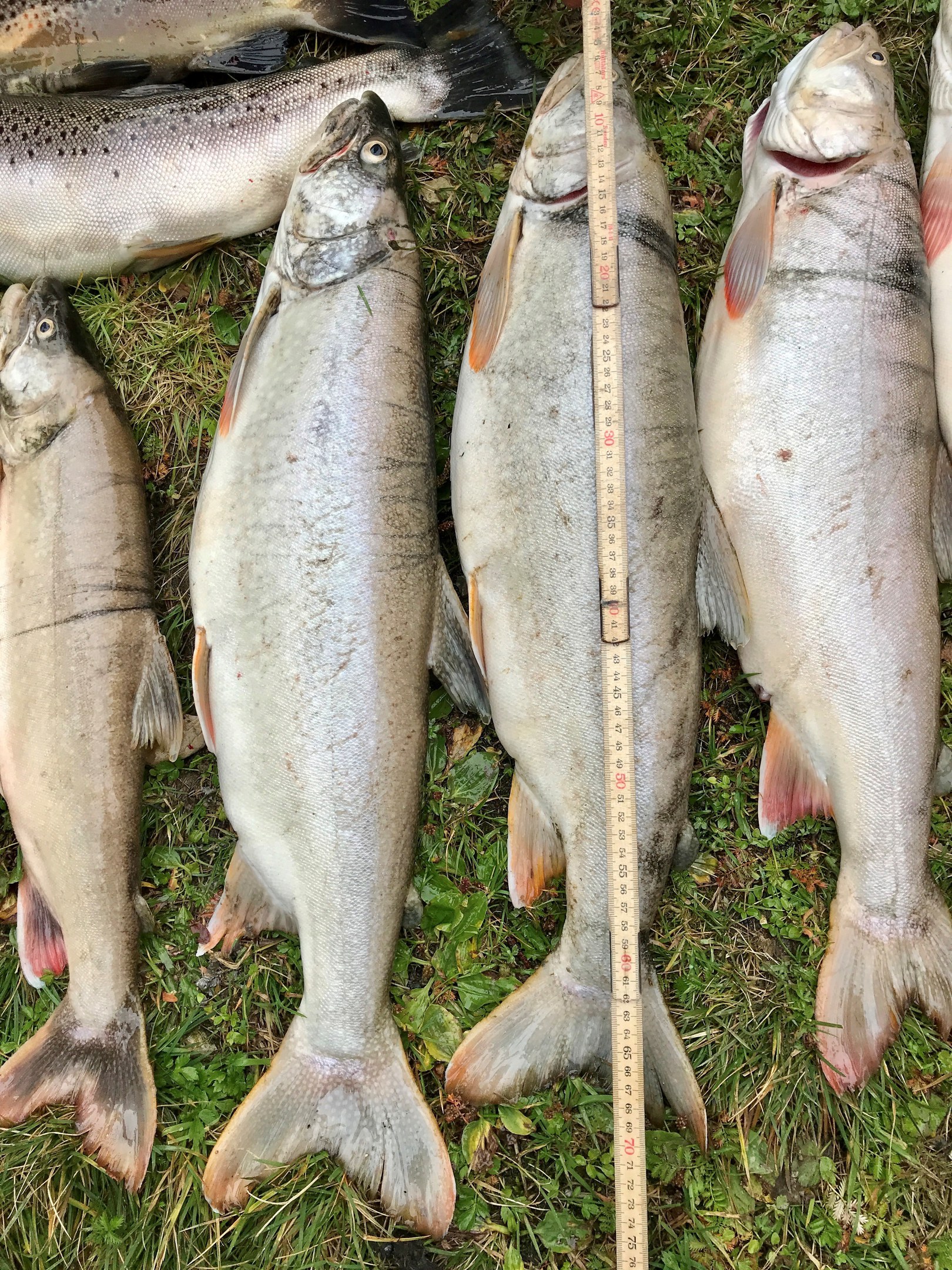 Mit Unterstützung eines spezialisierten Teams aus dem Kanton Tessin und unter der Leitung der Fischereiverwaltung Appenzell I.Rh. konnten insgesamt sieben grosse Namaycush entnommen werden. Die gefangenen Fische erreichten bis 74.5cm Länge und wurden bis zu 4.7kg schwer. In Anbetracht dessen, dass sich die nicht heimischen Namaycush ab etwa 30cm nur noch von anderen Fischen ernähren und für die Produktion des eigenen Körpergewichts etwa das zehnfache an Frischfisch zu sich nehmen müssen, ist der Einfluss der entnommenen Fische beträchtlich. Die gefangenen Namaycush wurden gemessen, gewogen und untersucht. Die Analyse der Mageninhalte zeigte, dass die Fische bis zu 26.5cm grosse heimische Seesaiblinge (Salvelinus alpinus) erbeutet und bis zu drei Beutefische gleichzeitig im Magen hatten. Es erstaunt deshalb nicht, dass die für die Angelfischerei interessanten und fangbaren Fische ab 30cm Länge kaum mehr im See vorhanden waren. Interessant ist auch die Tatsache, dass in den letzten Jahren lediglich einzelne oder gar keine grossen Namaycush durch die Angelfischerei gefangen werden konnten. Die Vermutung, dass sich die Namaycush ab einer gewissen Grösse lediglich sehr schwer durch die Angelfischerei fangen lassen, wurde somit ebenfalls bestätigt. Ein entsprechender Schlussbericht befindet sich in Erarbeitung und wird im Verlaufe des Herbsts 2018 publiziert.