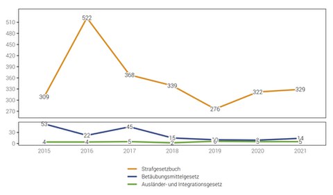 Bei Betrachtung der Straftaten nach Titel im Strafgesetzbuch und den Nebengesetzen (Auswahl) können folgende Entwicklungen im Jahr 2021 beobachtet werden: Strafgesetzbuch – Straftaten gegen die Rechtspflege |