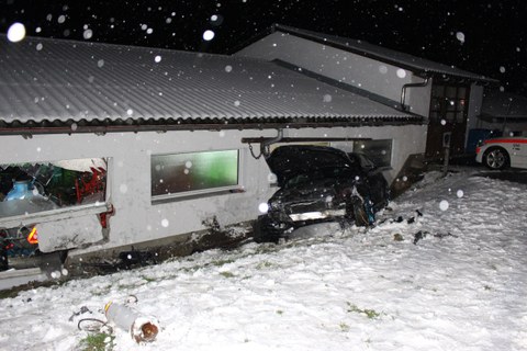 Am Montagabend (10.12.2018) fuhr ein 22-jähirger Mann mit seinem Auto von Brülisau her in Richtung Steinegg. Auf der verschneiten Fahrbahn rutschte das Fahrzeug in einer Rechtskurve geradeaus über die Gegenfahrbahn. In der angrenzenden Wiese fuhr er einen Hydranten ab und kollidierte mit der Wand einer Einstellhalle. Das Fahrzeug war mit vier Personen besetzt, wovon eine in ärztliche Kontrolle gebracht wurde.