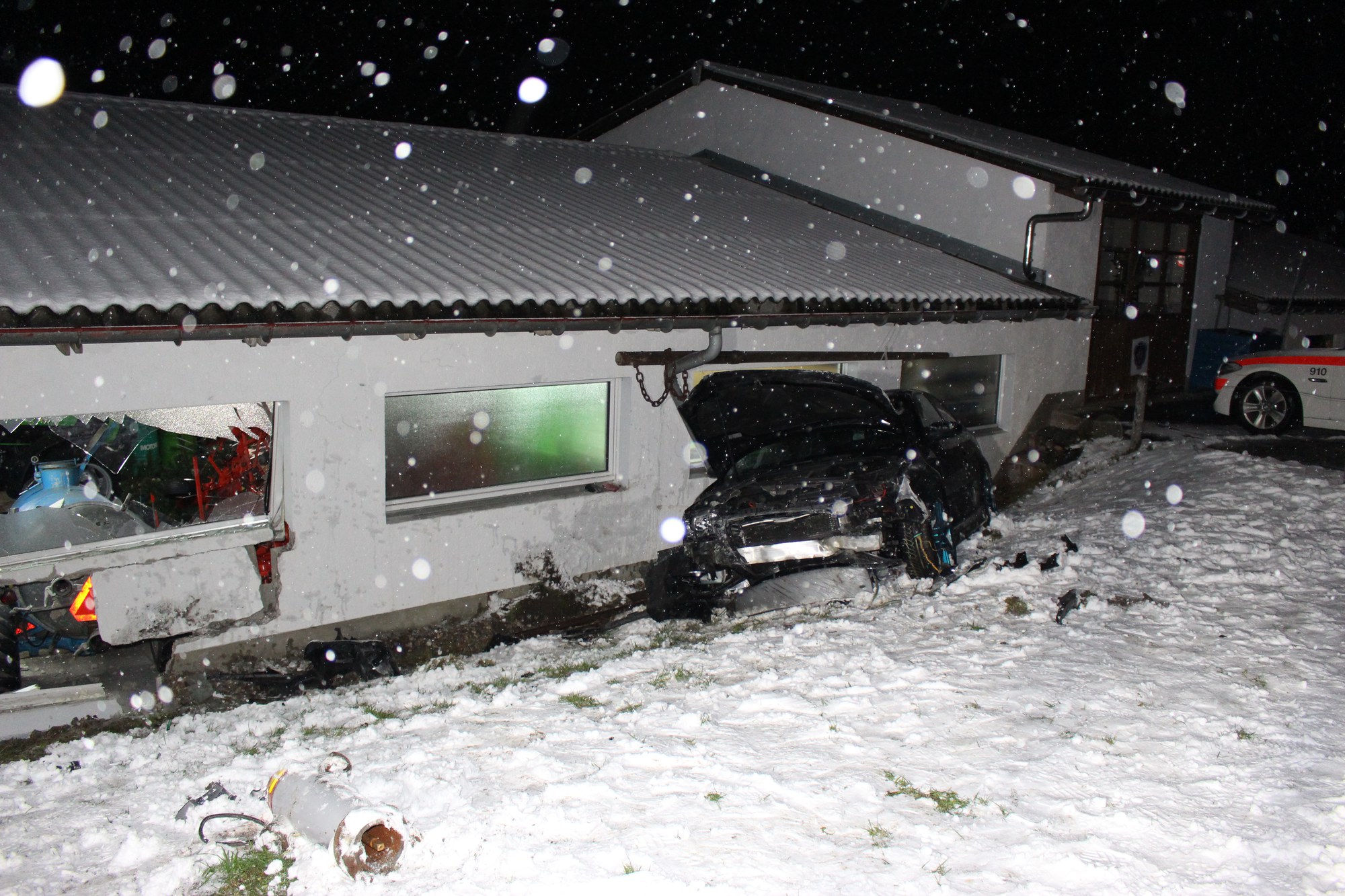 Mitfahrer leicht verletzt / grosser Sachschaden an Pw und Einstellhalle