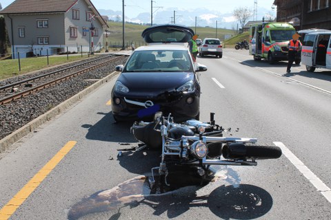 Am Samstagnachmittag (30.03.2019) fuhr ein 56-jähriger Motorradlenker von Appenzell her in Richtung Gais. Auf der Höhe der Liegenschaft Zünglers wollte er nach links zum dortigen Restaurant abbiegen. Deshalb bremste er sein Fahrzeug bis zum Stillstand ab. Gleichzeitig fuhr eine 52-jährige Frau mit ihrem Auto in dieselbe Richtung und sah das in der Fahrbahn stillstehende Motorrad zu spät. Trotz eingeleiteter Bremsung kam es zu einer heftigen Auffahrkollision zwischen den beiden Fahrzeugen. Der Motorradlenker stürzte zu Boden und schlug mit dem Kopf auf den Asphaltbelag. Er wurde mit der Ambulanz vom Spital Appenzell in Spitalpflege gebracht. Am Auto und am Motorrad entstand beträchtlicher Sachschaden.