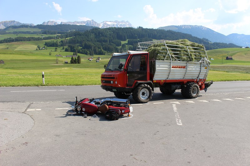 Am Mittwochvesper (05.06.2019) fuhr ein 24-jähriger Landwirt mit einem landwirtschaftlichen Motorkarren von Gonten her in Richtung Gontenbad. Kurz vor dem Bahnübergang Zoll wollte er nach links in die Steinstrasse abbiegen. Ein nachfolgender 65-jähriger Motorradlenker wollte das landwirtschaftliche Gefährt überholen. Dabei kam es zu einer leichten Kollision zwischen den beiden Fahrzeugen. Der Motorradfahrer stürzte und zog sich noch unbestimmte Kopfverletzungen zu. Er wurde mit der Ambulanz in Spitalpflege gebracht.