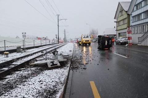 Am Sonntagvormittag (17.11.2019) fuhr eine junge Frau von Gais her in Richtung Appenzell. In Meistersrüte geriet ihr Fahrzeug aus noch nicht geklärten Gründen auf das linksseitige Trassee der Appenzellerbahnen. In der Folge kippte das Fahrzeug auf die Seite und kam mitten in der Gaiserstrasse zum Stillstand. Die Fahrzeuglenkerin blieb glücklicherweise unverletzt, ging aber noch am Sonntagvormittag zur Untersuchung zu ihrer Hausärztin. Am Auto entstand beträchtlicher Sachschaden. An der Gleisanlage der Appenzellerbahnen entstand ebenfalls erheblicher Sachschaden, weshalb der Bahnbetrieb einstweilen auf Ersatzbusse umgestellt wurde.