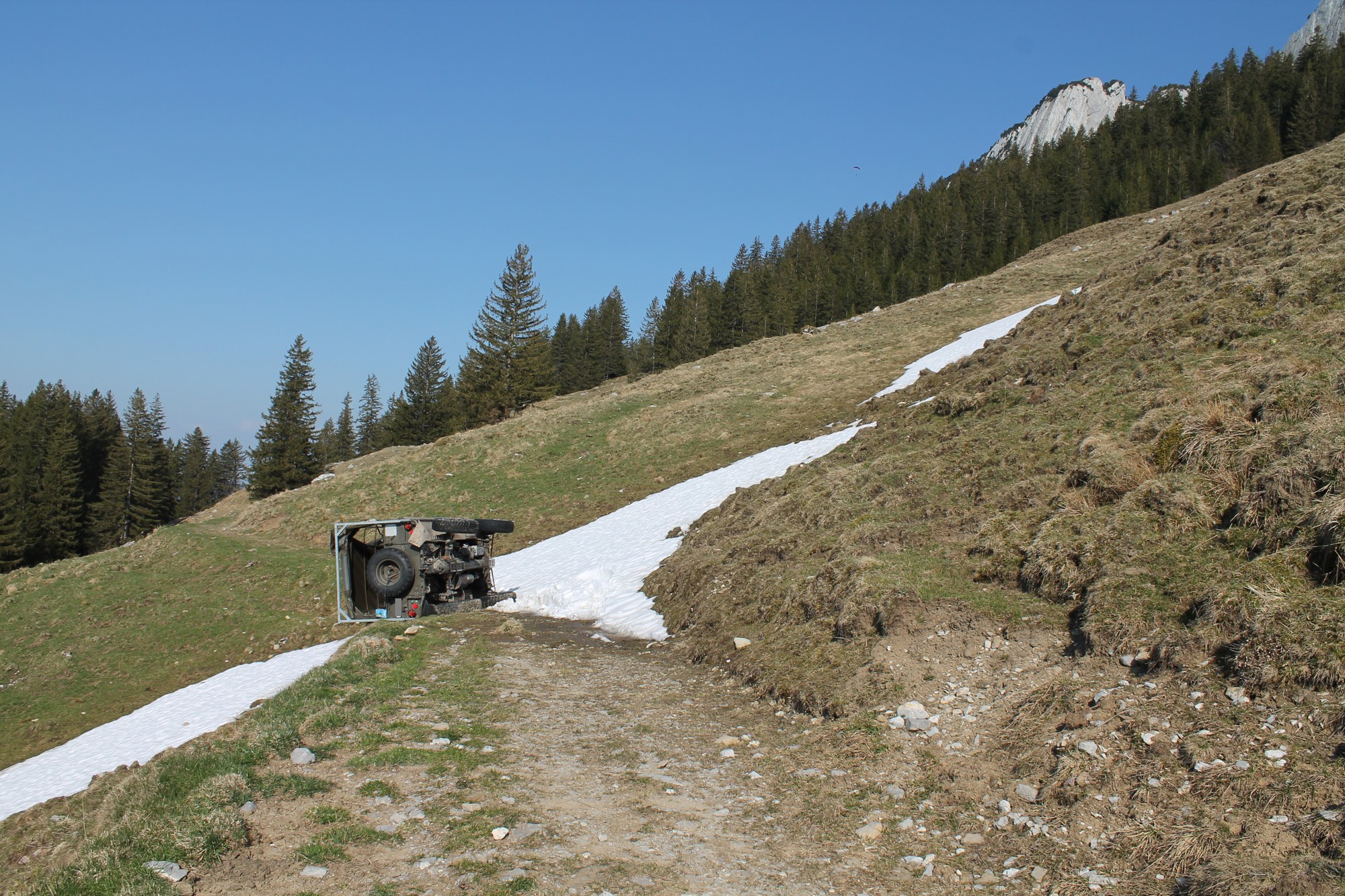 Am Ostersamstag (11.04.2020) kurz vor 16.00 Uhr befuhren bislang unbekannte junge Menschen die Flurstrasse im Bereich der Alp Hundslanden. Beim Queren eines kleinen Schneefeldes kippte der «Pinzgauer» auf die Seite. Die vier Fahrzeuginsassen verliessen das Fahrzeug und entfernten sich von der Unfallstelle.