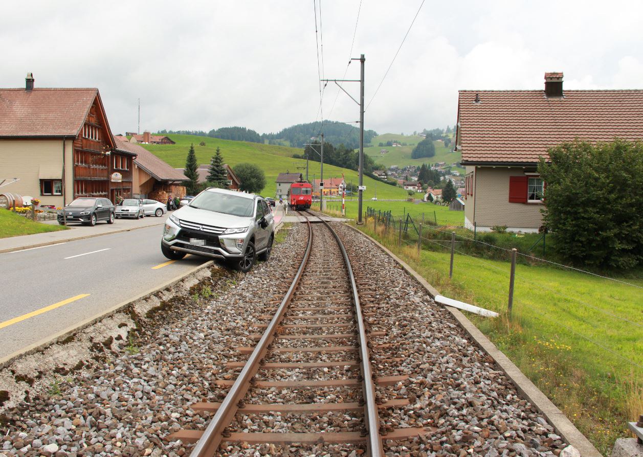 Am Sonntagvormittag (22.07.2018), fuhr ein Personenwagenlenker auf der Gaiserstrasse von Gais in Richtung Meistersrüte. Im Bereich Zünglers geriet der Lenker mit seinem Pw aus bislang unbekannten Gründen auf die Gegenfahrbahn, fuhr über den linkseitigen Strassenrand und kam auf dem Trasse der Appenzellerbahnen zum Stillstand. Die Lokomotivführerin der Appenzellerbahn konnte trotz eingeleiteter Notbremsung eine leichte Streifkollision nicht mehr verhindern. Personen kamen nicht zu Schaden. An den beteiligten Fahrzeugen entstand Sachschaden von einigen tausend Franken. Der Bahnverkehr musste für rund eine Stunde unterbrochen werden.