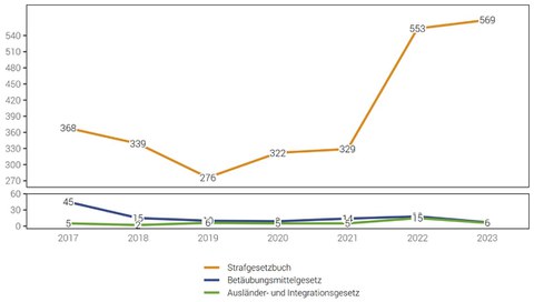 Seit 2009 wird die Polizeiliche Kriminalstatistik (PKS) nach einheitlichen Vorgaben des Bundesamtes für Statistik erstellt. Die im Kanton Appenzell Innerrhoden verübten Straftaten werden darin erfasst und auf Jahresbasis ausgewertet. Das Jahr 2023 war für die Kantonspolizei Appenzell Innerrhoden mit insgesamt 616 registrierten Straftaten wiederum ein sehr intensives Jahr. Im Bereich des Strafgesetzbuchs (StGB) wurde in diesem Berichtsjahr mit 569 Straftaten ein neuer Höchststand erreicht. Dieser Höchststand entspricht einer Zunahme zum Vorjahr um 3%. Dazu kommen 7 Straftaten gegen das Betäubungsmittelgesetz (BetmG) (-61%) und 6 Straftaten gegen das Ausländergesetz (AIG) (-60%). Die Verstösse gegen übrige Bundesnebengesetze schlagen mit 34 Straftaten zu Buche (-11%).