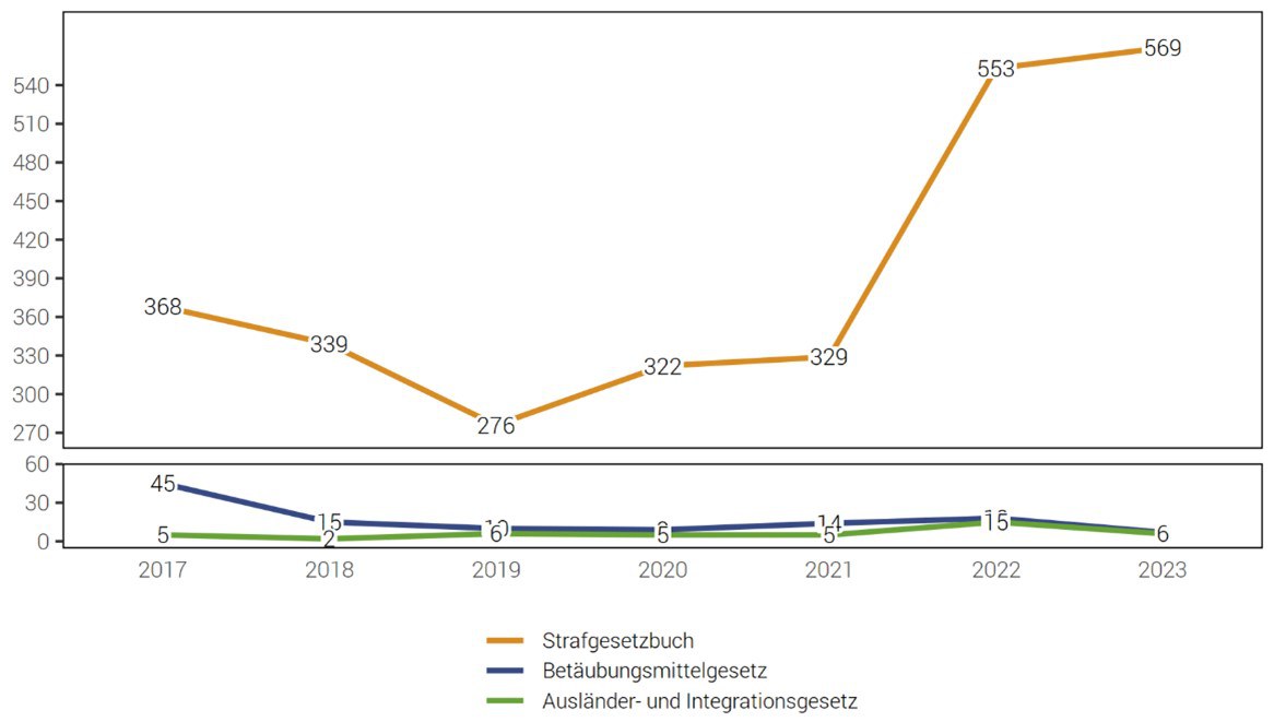 In der Deliktskategorie Gewaltstraftaten wurden im Jahr 2023 gesamthaft 51 Fälle registriert. Das entspricht einer Abnahme von 14%. Bei den schweren Gewaltdelikten, dazu zählen namentlich Tötungsdelikte, schwere Körperverletzungen, Vergewaltigungen und qualifizierte Raubdelikte, ist im Jahr 2023 keine Straftat zu verzeichnen. Zum Vergleich: im Jahr 2022 wurde 1 Straftat registriert.