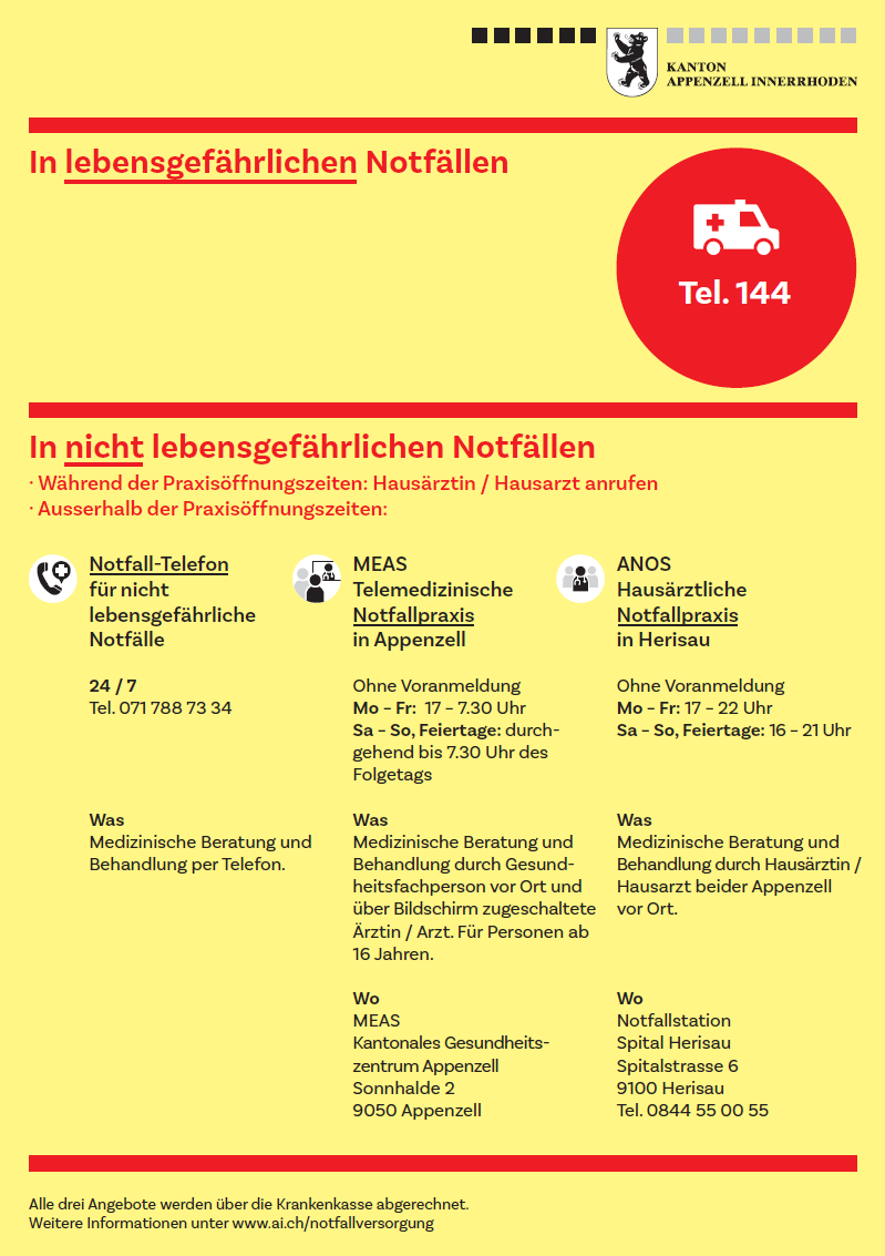 Das Spital Appenzell wurde per 30. Juni 2021 geschlossen – bei einem Notfall beachten Sie bitte das Dokument "Notfallkontakte Appenzell I.Rh.".