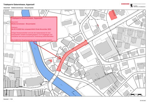 Die Gaiserstrasse sowie die darin liegenden Werkleitungen befinden sich in einem sanierungsbedürftigen Zustand. Die Strasse sowie die Werkleitungen werden deshalb instandgesetzt. In einem ersten Schritt werden die bestehenden Werkleitungen im gesamten Abschnitt erneuert. Im Anschluss werden neue Randabschlüsse versetzt sowie neue Beläge eingebaut. Die Bauarbeiten starten am Montag, 3. Oktober 2022, und dauern voraussichtlich bis Ende November 2022. Die Gaiserstrasse wird ab dem 5. Oktober 2022 für den motorisierten Verkehr gesperrt. Eine Umleitung Richtung Brauereiplatz – Weissbadstrasse – Gringel via Steinegg wird signalisiert. Die Zufahrten zu den Liegenschaften an der Gaiserstrasse sind bis zur Blumenrainstrasse, respektive Blattenrainstrasse möglich. Für Fussgängerinnen und Fussgänger sowie Radfahrerinnen und Radfahrer wird während der gesamten Bauzeit eine provisorische Verbindung aufrechterhalten.