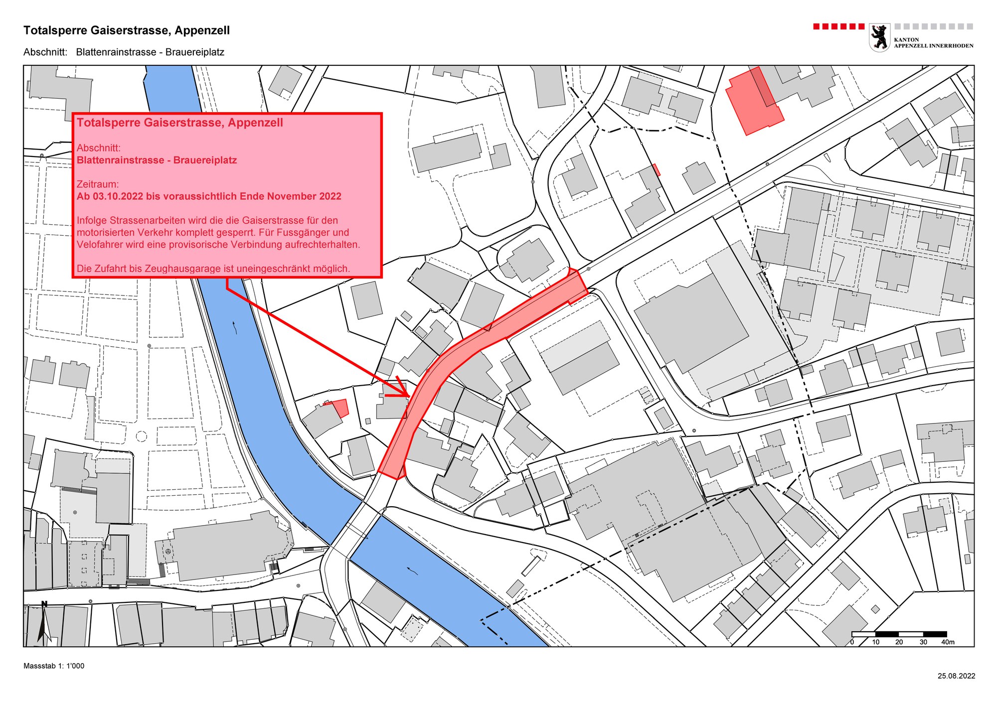 Am Montag, 3. Oktober 2022, startet das Landesbauamt zusammen mit der Feuerschaugemeinde Appenzell und dem Amt für Umwelt mit den Bauarbeiten für die Sanierung der Gaiserstrasse im Abschnitt Blattenrainstrasse bis Brauereiplatz. Aufgrund der engen Platzverhältnisse wird die Gaiserstrasse in diesem Abschnitt ab dem 5. Oktober 2022 für den motorisierten Verkehr gesperrt. Die Arbeiten dauern voraussichtlich bis Ende November 2022.