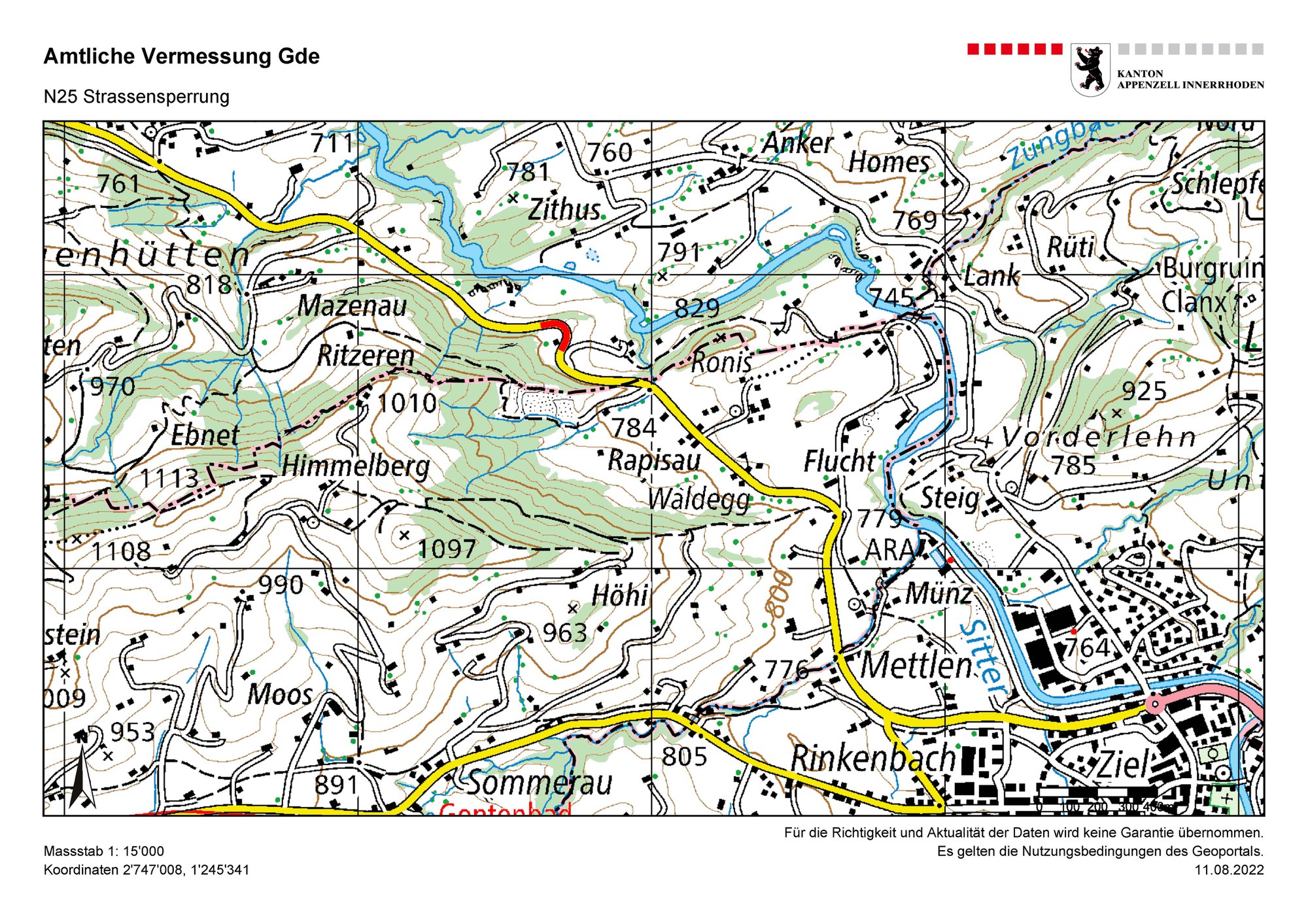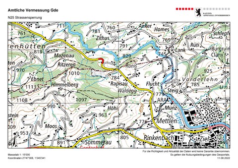 Bezirk Schlatt-Haslen Teilstück N25 (Enggenhüttenstrasse) Abschnitt KM 15.08 bis KM 15.22 SOS Kurve Dauer der Sperrung: Montag, 29. August 2022, 07.00 Uhr, bis Donnerstag, 1. September 2022, 04.00 Uhr