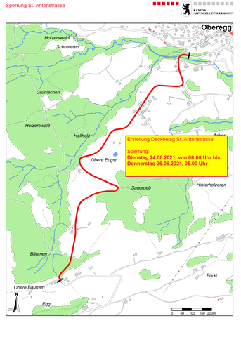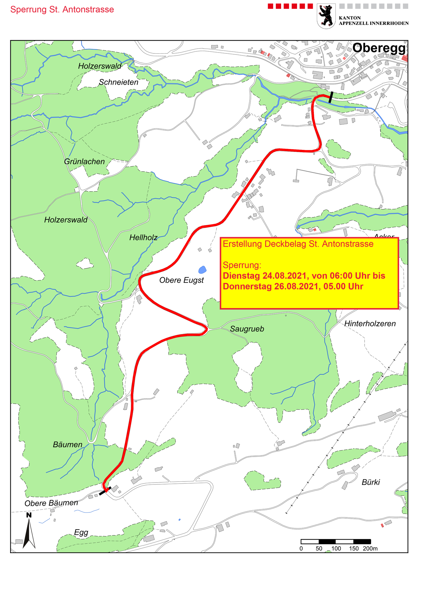 Die Postautohaltestellen der Linie 80.229 Asylstrasse, Bissau, Wässern, Riethof, Rut-lenstrasse, Oberegg Post, Eugst, Bäumen, St. Anton und Kappelle werden während der Sperrung nicht bedient.