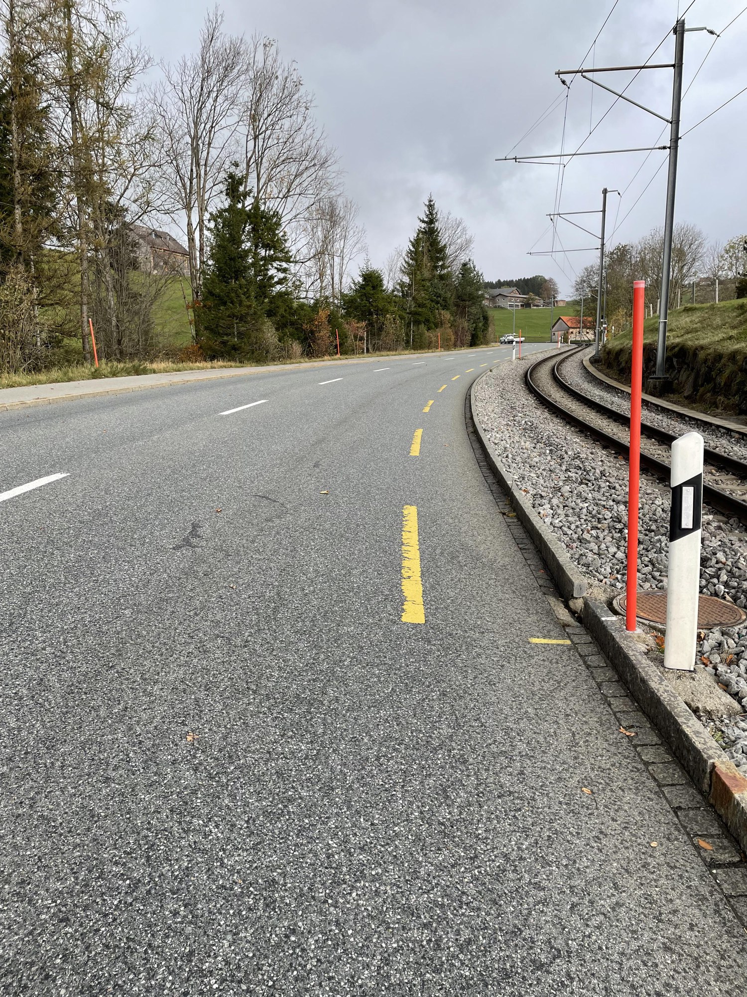 Für das Durch- und Befahren sollen Radverkehrsanlagen sicher, kohärent, direkt und komfortabel sein. Zudem sollen sie ein zusammenhängendes Netz bilden. Für Radstreifen wird im Minimum eine Breite von 1.5m empfohlen. Je nach vorhandenem Längsgefälle sollen Radstreifen eine Breite von mehr als 1.5m aufweisen. Aufgrund der vorhandenen Strassenbreite wird auf der Gaiserstrasse im gesamten Abschnitt ein Radstreifen mit einer Breite von 1.5m markiert. Dafür muss die bestehende Mittellinie im Ausserortsbereich zusätzlich verschoben werden. Im Innerortsbereich wird künftig auf eine Markierung der Mittellinie verzichtet, ausgenommen in Knotenbereichen als Linksabbiegehilfe. Falls das Wetter und die Temperaturen es zulassen, werden die Markierungsarbeiten in den kommenden Tagen ausgeführt.