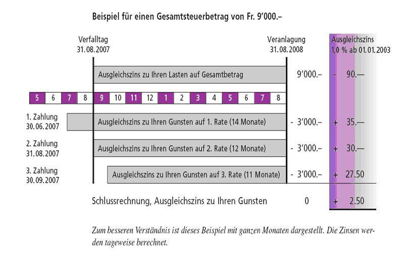 - Die Ausgleichszinsen haben nicht zum Ziel, dem Kanton, den Bezirken und Gemeinden zusätzliche Steuereinnahmen zu bescheren. Sie schaffen lediglich einen gerechten Ausgleich zwischen Steuerpflichtigen, die ihre Steuern sofort bezahlen und solchen, die sich dafür mehr Zeit nehmen. Sie stellen mit einem angemessenen Zinssatz sicher, dass alle Steuerzahler(innen) bezogen auf ihre definitive Steuerschuld finanziell gleichmässig behandelt werden, ob sie nun eine zu hohe, zu tiefe oder exakt zutreffende provisorische Rechnung erhalten und bezahlen.