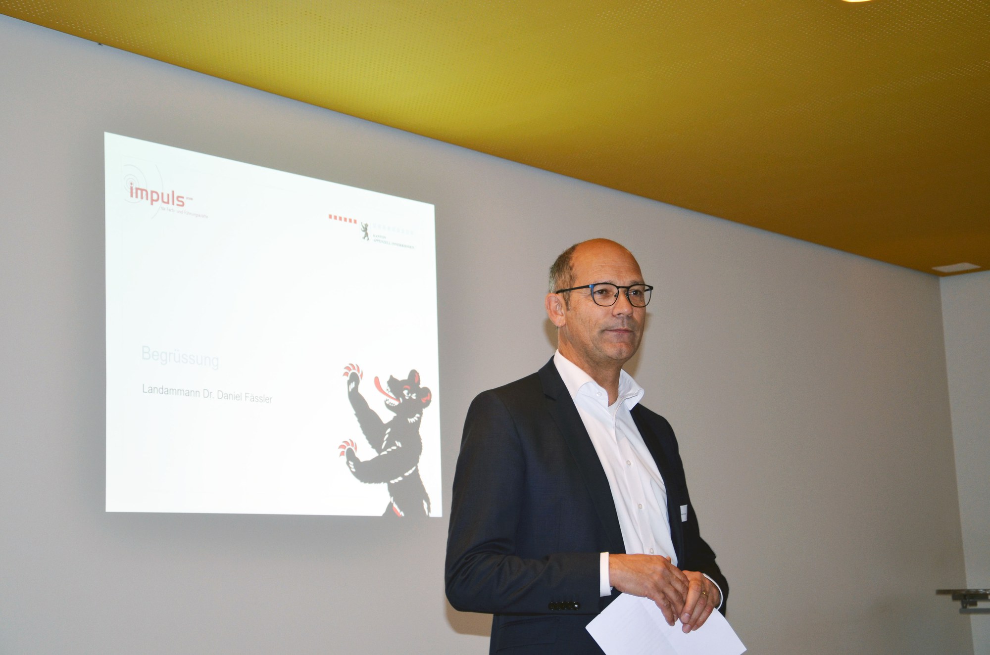 Nach der Begrüssung durch Landammann Daniel Fässler führte Prof. Roman Boutellier, Präsident der Appenzeller Kantonalbank, unter dem Präsentationstitel «…wenn das Gute liegt so nah?» ins Thema ein. Er betonte, wie wichtig es sei, in der Ferne Erfahrungen zu sammeln und wertvolle Kontakte zu knüpfen. Prof. Roman Boutellier strich jedoch auch die zahlreichen Vorteile wie zum Beispiel die kurzen Wege und die Vielfalt der Beruf sowie guten Rahmenbedingungen im Kanton Appenzell I.Rh. heraus, welche ein Rückkehr durchaus attraktiv machen.