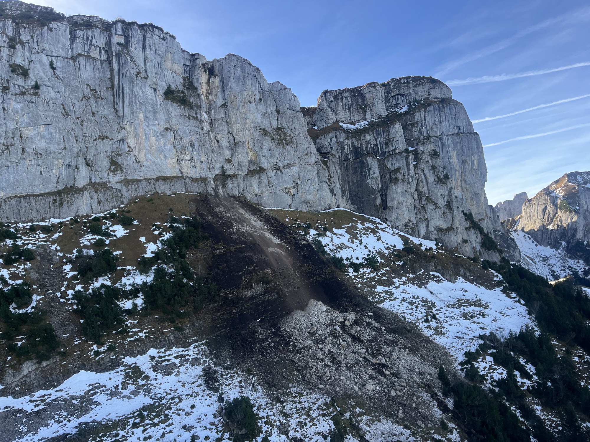 Aus dem Erkundungsflug war ersichtlich, dass die Spuren des Abbruchs bis in den Schutzwald reichen. Unterhalb des Waldes waren keine Spuren erkennbar.