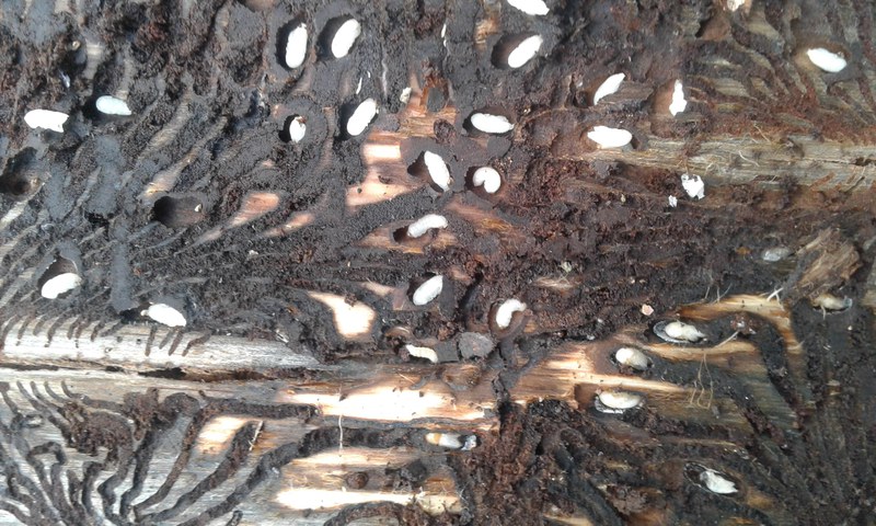 Angesichts dieser Zahlen und der anhaltend trockenen und heissen Witterung kann weiterhin keine Entwarnung gegeben werden. Es sind weiterhin „frisch“ vom Käfer, genauer gesagt vom Buchdrucker (Ips typographus), befallende Fichten festzustellen. Vermehrt auch im Inneren der Bestände. Befallene Bäume sind allerdings nicht immer einfach und sofort als solche zu erkennen. Das normalerweise typische Bohrmehl am Stammfuss und hinter Rindenschuppen (siehe Beitrag vom 23. Juli 2018) ist nicht immer sichtbar. Ein typisches Zeichen sind abgefallene, mit Frassgängen versehene Rindenstücke. Da die Rinde vorzugsweise im Bereich des Kronenansatzes abzufallen beginnt, braucht es weiterhin „den Blick nach oben“. Eine befallene Fichte kann noch wochenlang grüne Nadeln tragen und somit „aus der Ferne“ nicht als befallen erkennbar sein. Setzt der Nadelfall ein, ist es höchste Zeit zu handeln.