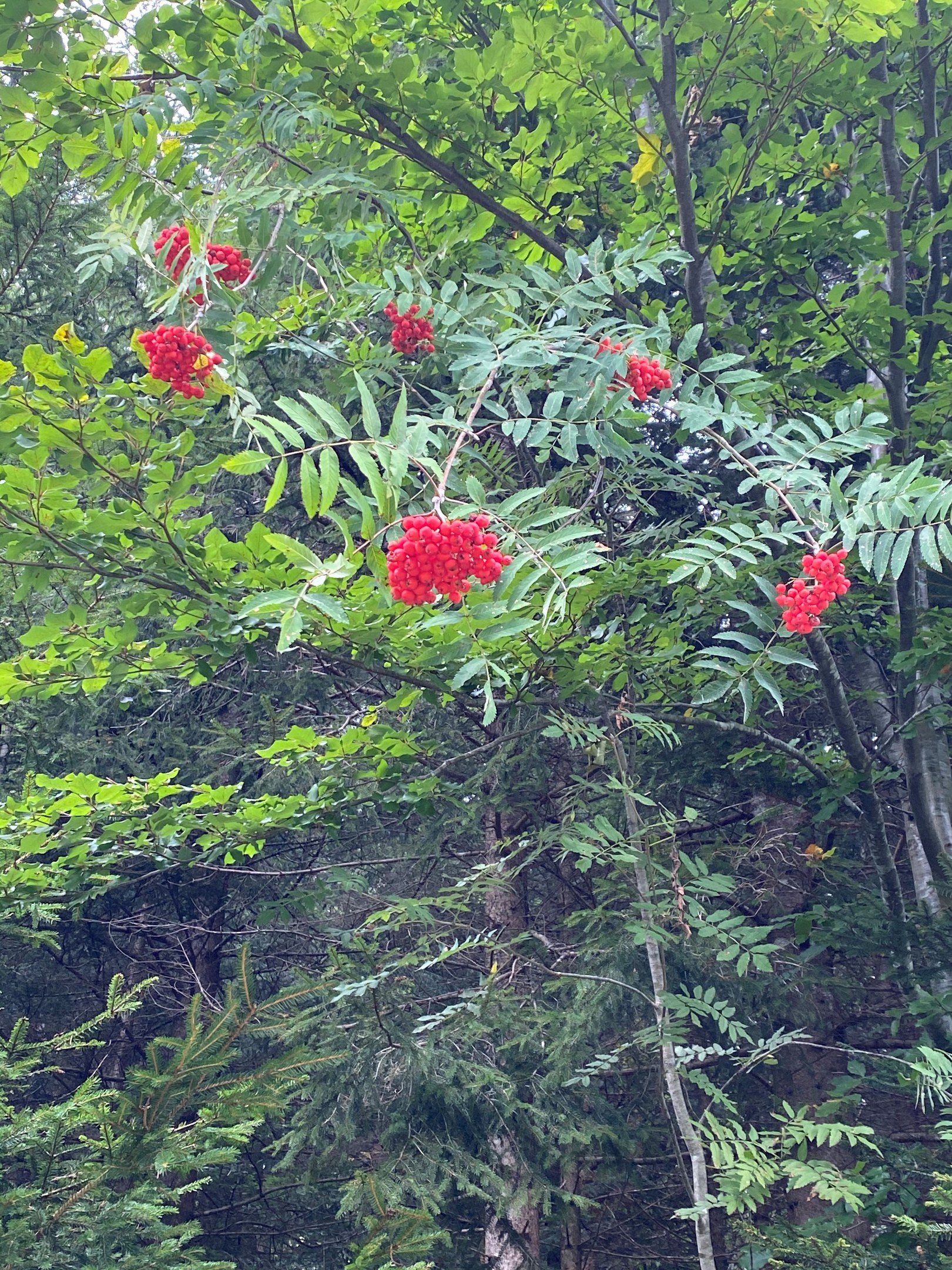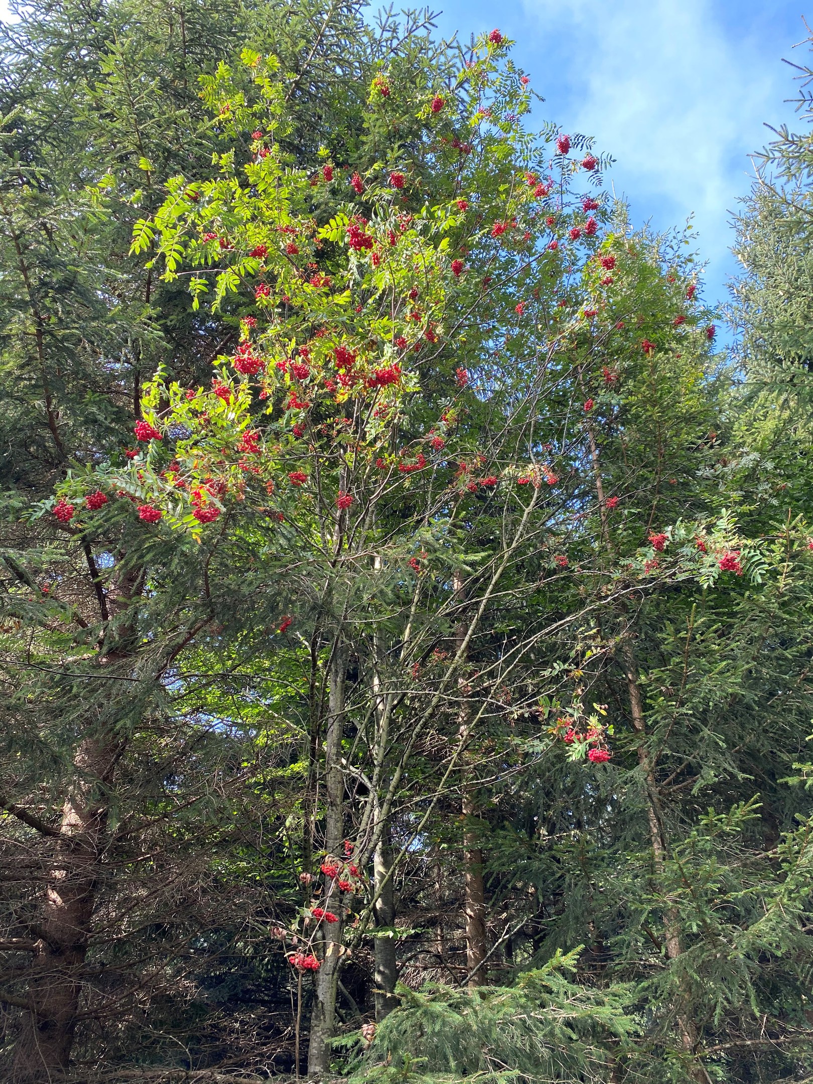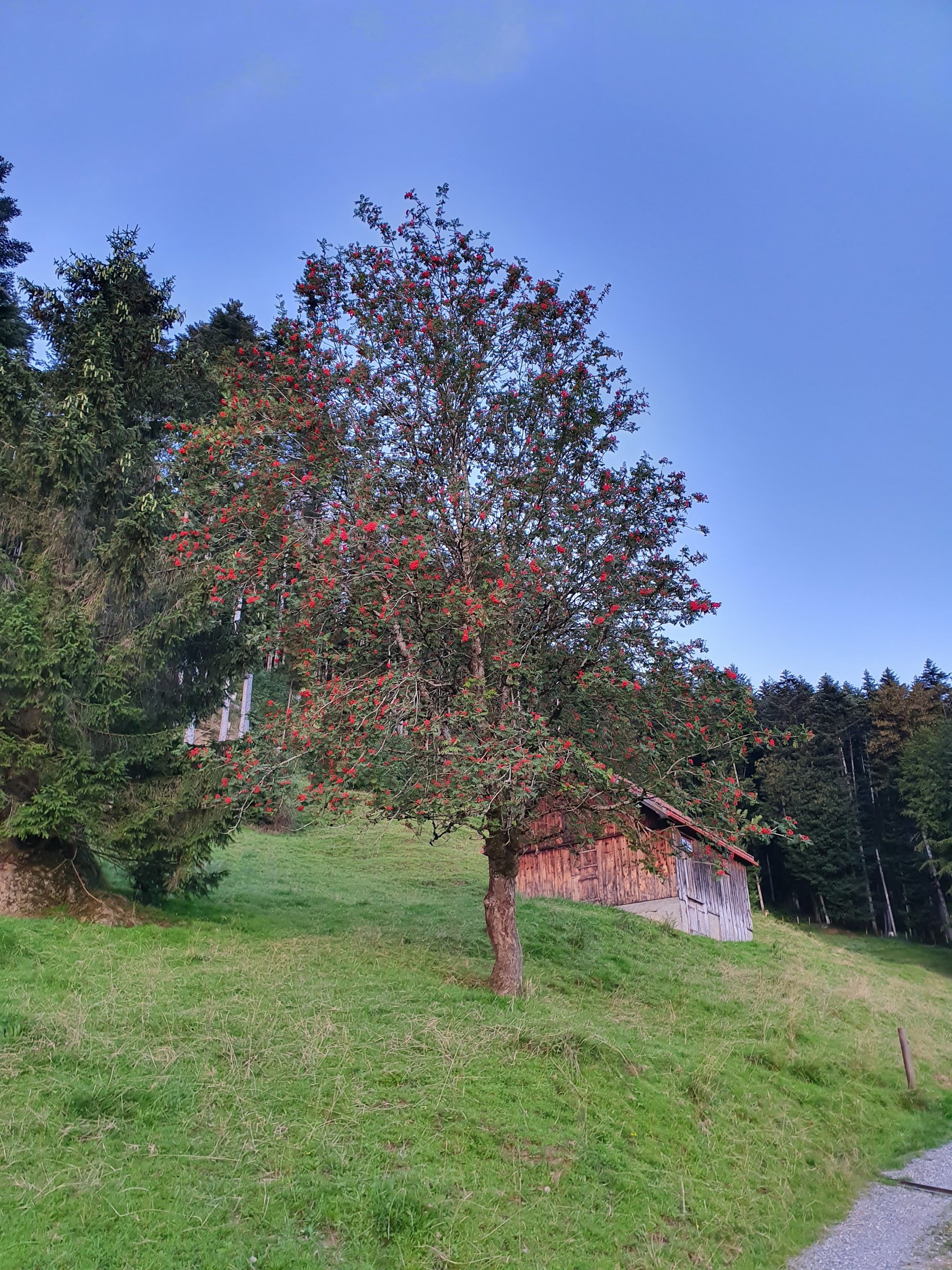 Jetzt leuchtet er wieder im Appenzellerland. Der Vogelbeerbaum (oder wie man hier in Appenzell sagt: Vogelbei-Bomm) kommt nur im Frühling, wenn er blüht und jetzt im Herbst mit seinen roten auffälligen Früchten zur Geltung.
