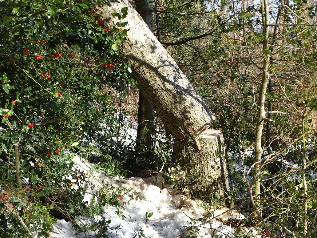 Der für diesen Kurs zur Verfügung gestellte Wald stellte für die Teilnehmer eine zusätzliche Herausforderung bereit. Dort wachsen nämlich sehr viele Stechpalmen. Diese Gehölze sind teilweise geschützt. Man darf höchstens drei Zweige mit Beeren abschneiden. Aus diesem Grunde mussten die Kursteilnehmer die Fällrichtung der Bäume sehr, sehr sorgfältig festlegen, damit möglichst wenige Stechpalmen beschädigt wurden. Dies ist ihnen gut geglückt, wie Revierförster Thomas Gelbhaar beim Kursende feststellen durfte.