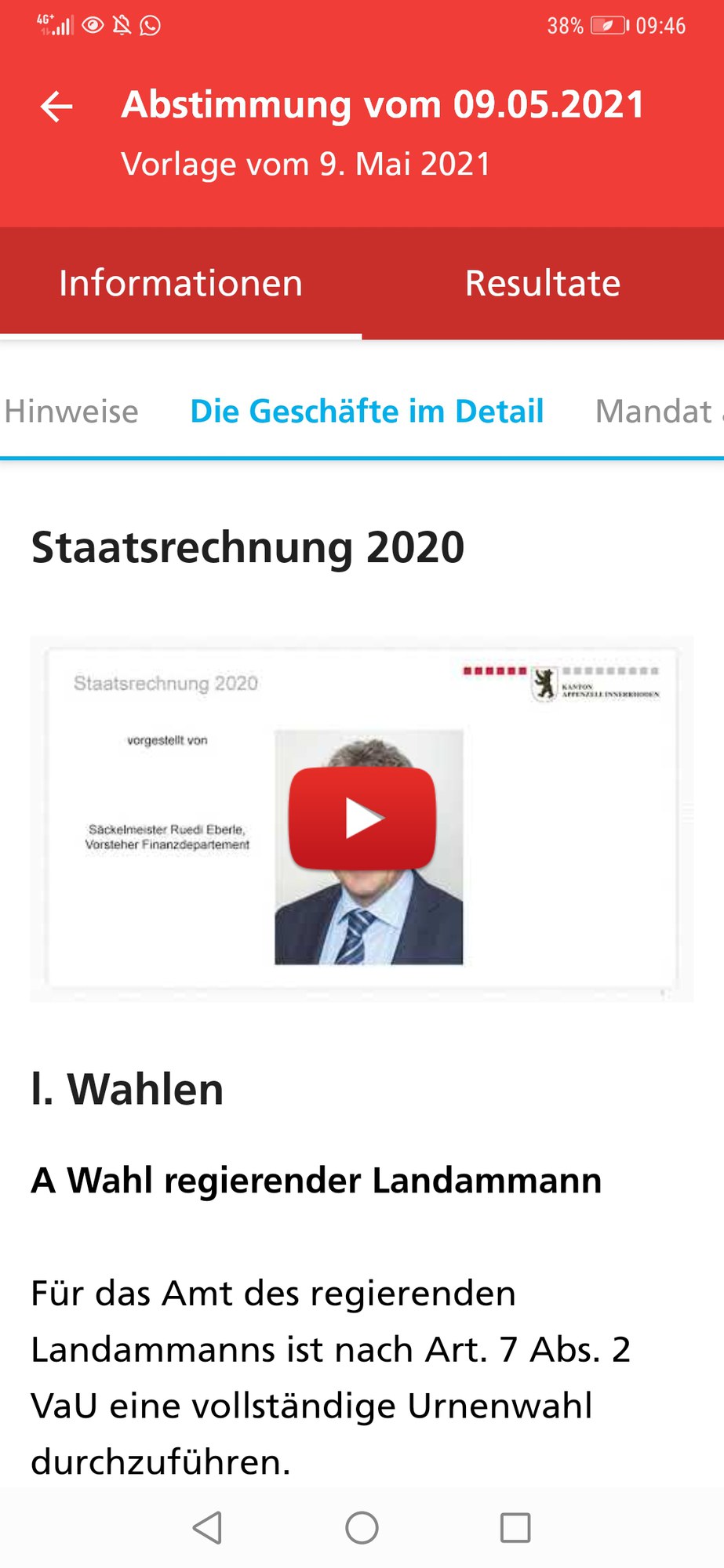 Die von der Bundeskanzlei zusammen mit dem Bundesamt für Statistik und dem Statistischen Amt des Kantons Zürich entwickelte App «VoteInfo» ist in Innerrhoden neu auf kantonaler Ebene im Einsatz. Die App bildet das Abstimmungsgeschehen der kantonalen Urnenabstimmung vom 9. Mai 2021 ab. Interessierte haben damit die Möglichkeit, auf dem Smartphone jederzeit Informationen aus dem Mandat abzurufen. Auch die Abstimmungsergebnisse werden am Abend des Abstimmungssonntags in der App aufgeschaltet. Die Aufschaltung der kantonalen Abstimmungsunterlagen und -ergebnisse in der App «VoteInfo» soll in Zukunft für Landsgemeindegeschäfte weitergeführt werden.