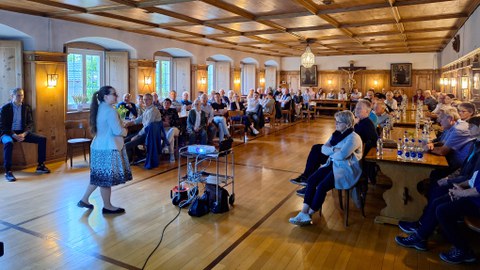 Markus Walt, der Leiter des Amts für Wirtschaft, begrüsste knapp 100 Interessierte im Refektorium des Klosters Maria der Engel und führte mit spannenden Zahlen in das Thema Erben und Vererben ein: So wollen etwa 91% der Erbenden und Erblasserinnen und Erblasser Streitigkeiten vermeiden, aber erst 14% nutzen die Möglichkeiten des neuen Erbrechts. Das auf die Begrüssung folgende Referat von Corina Omlin-Schmid, Leiterin Fachbereich Erbschaft, informierte über die Stolpersteine bei Erbschaftsangelegenheiten, und gab nützliche Tipps, um die häufigsten Versäumnisse frühzeitig zu verhindern. Die Möglichkeit, Fragen zu stellen und Fallbeispiele zu besprechen, wurde rege genutzt.